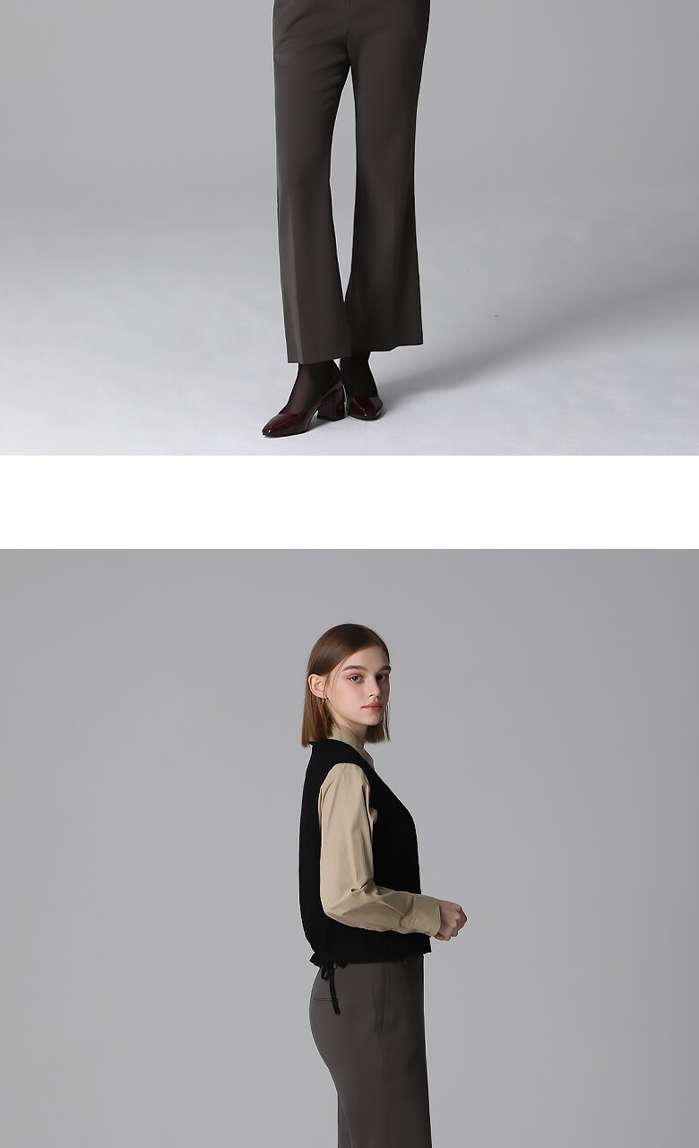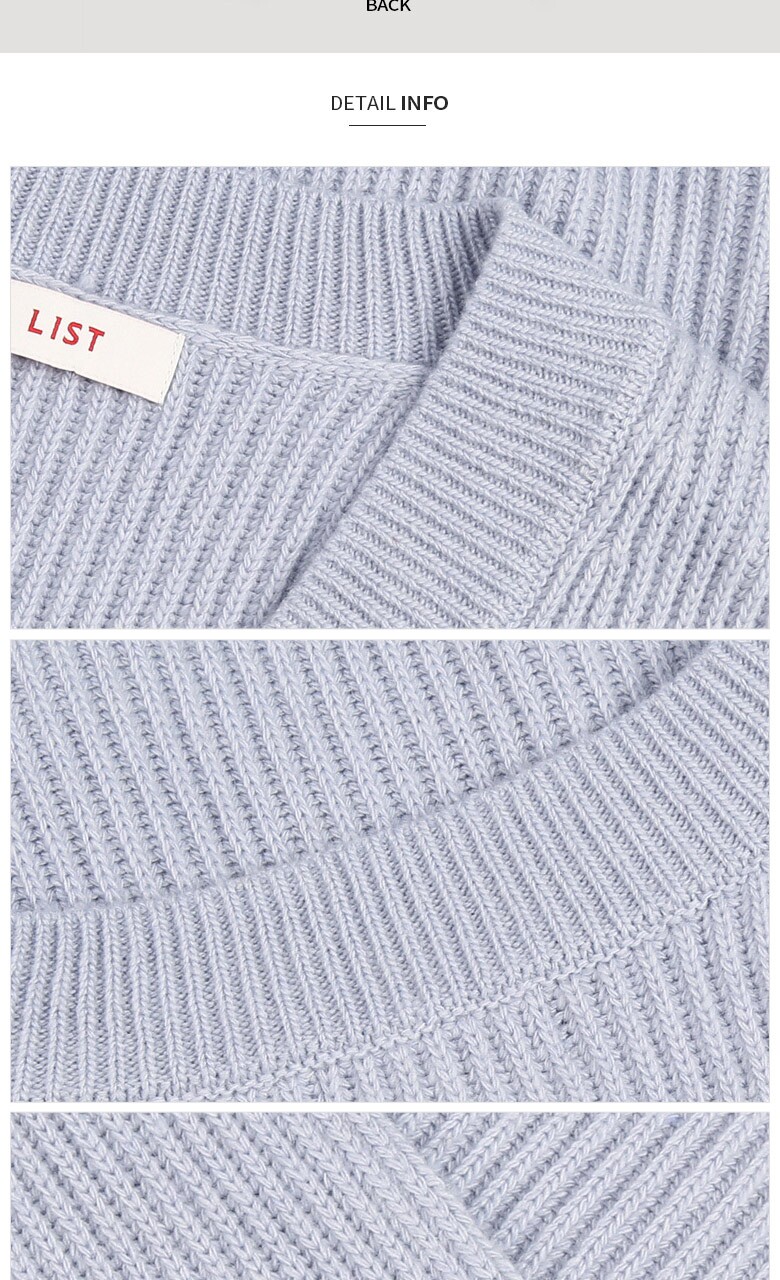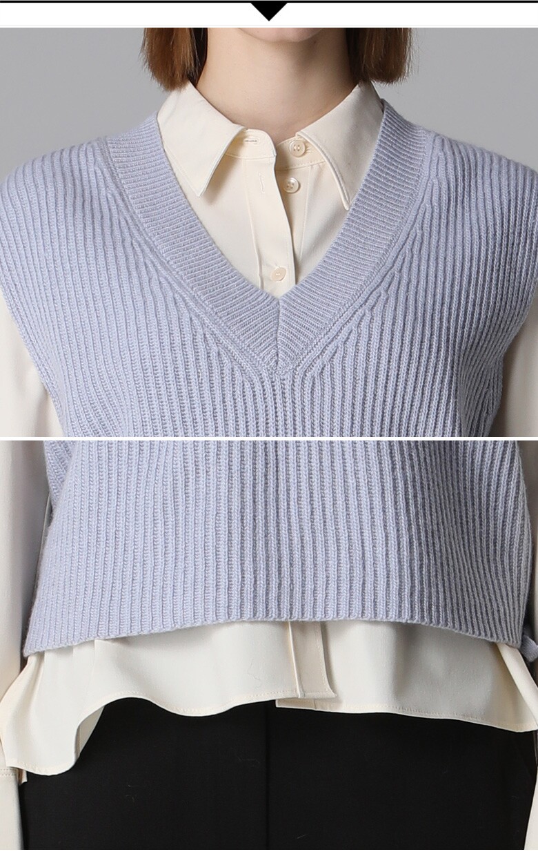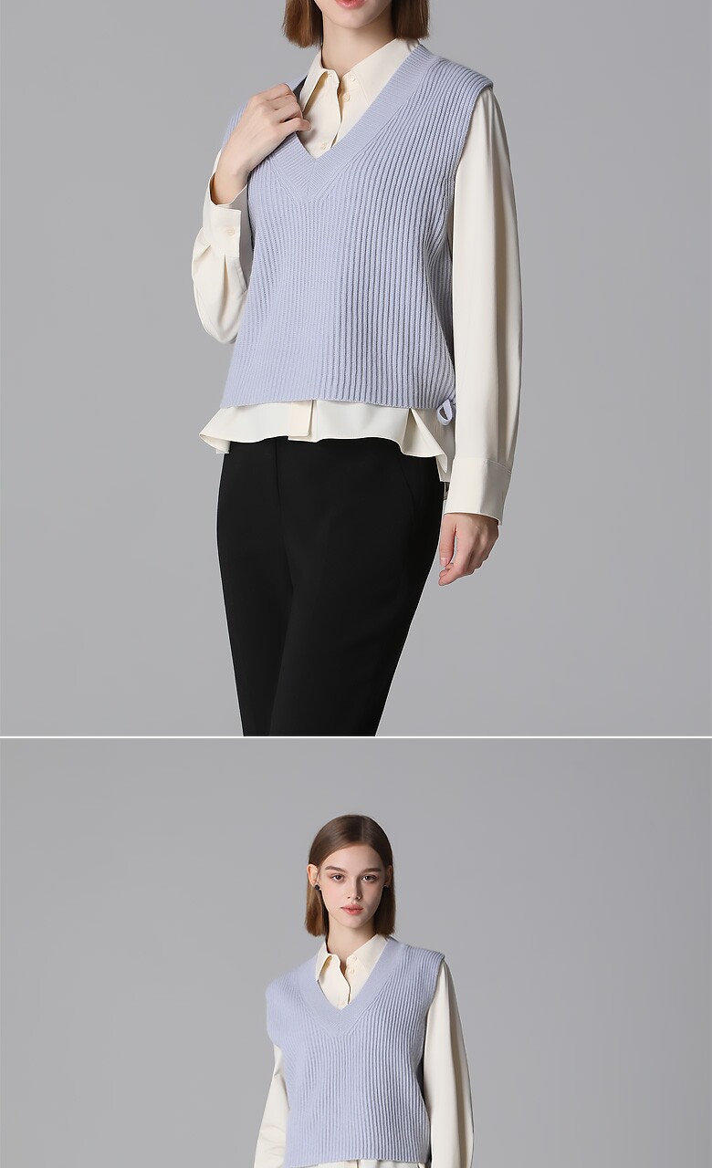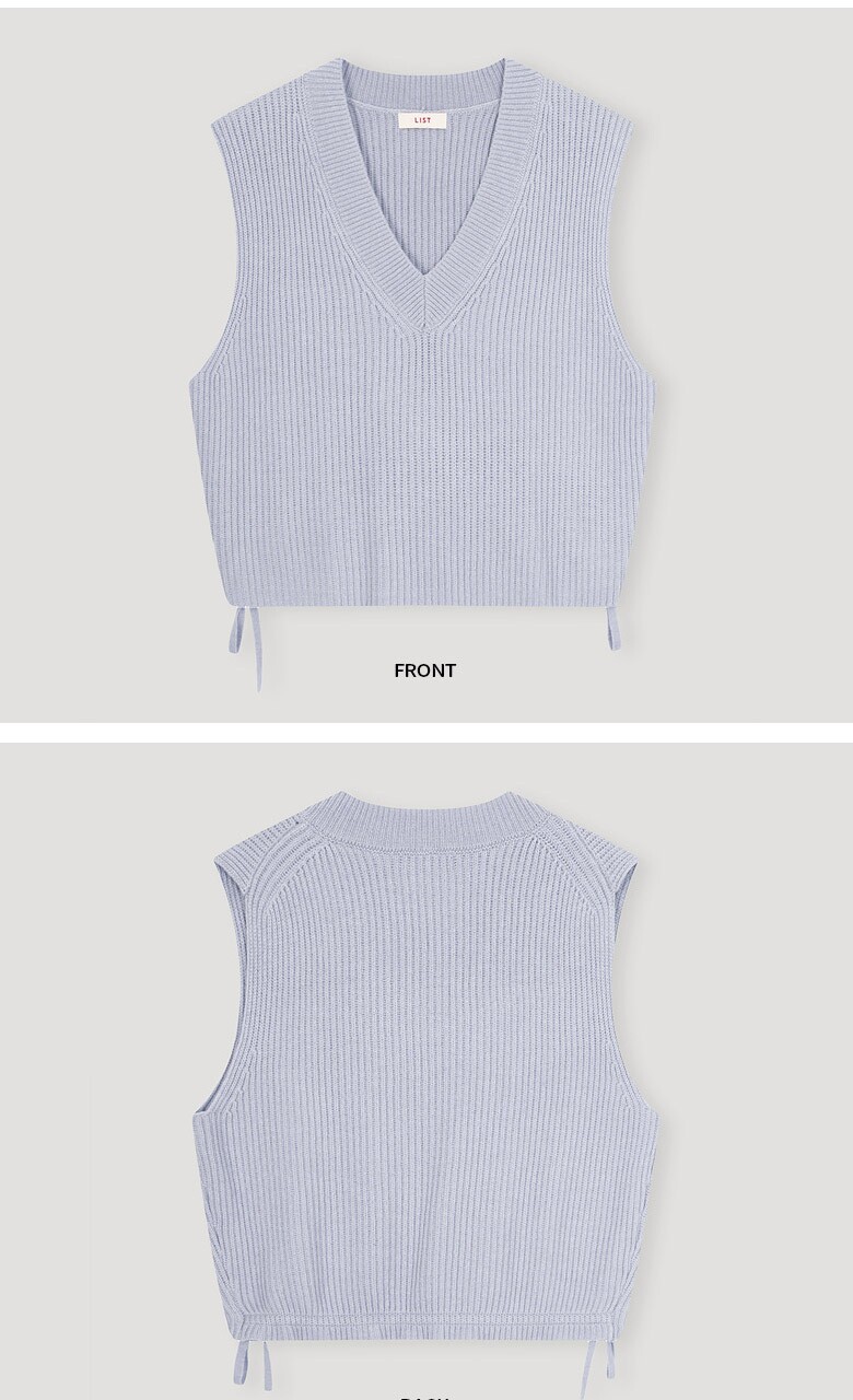 루즈한 핏감과 깊은 브이넥, 사이드 스트랩이 어우러진 니트 베스트입니다