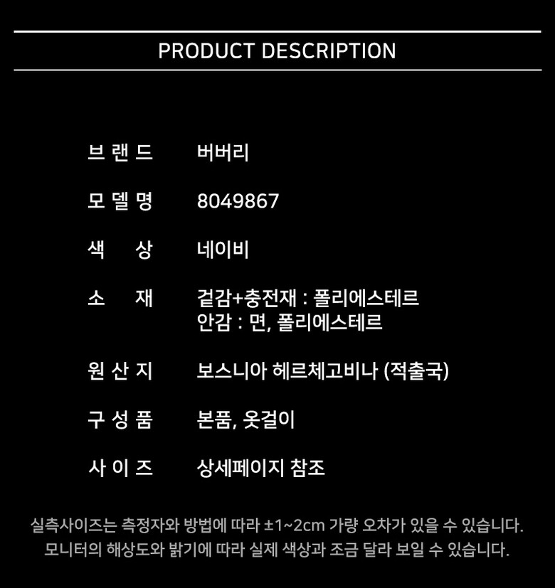 | 1. 제품 소재 (섬유의 조성 또는 혼용률을 백분율로 표시, 기능성인 경우 성적서 또는 허가서) | 상세페이지 참조 |