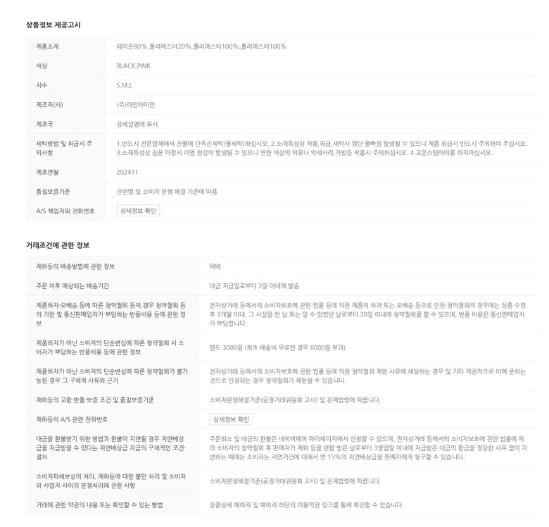 | 6. 세탁방법 및 취급시 주의사항 | 상품상세참조 |