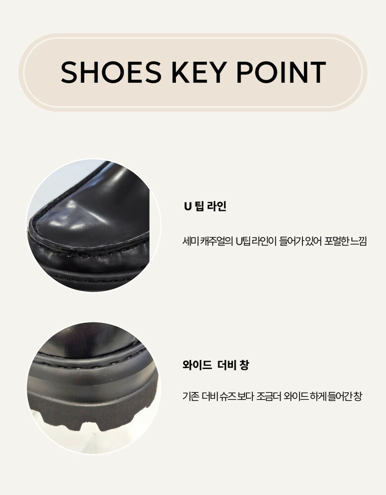 베이직한 기본 더비라인에 U팁 라인이 들어간 포멀한 세미 캐주얼 슈즈