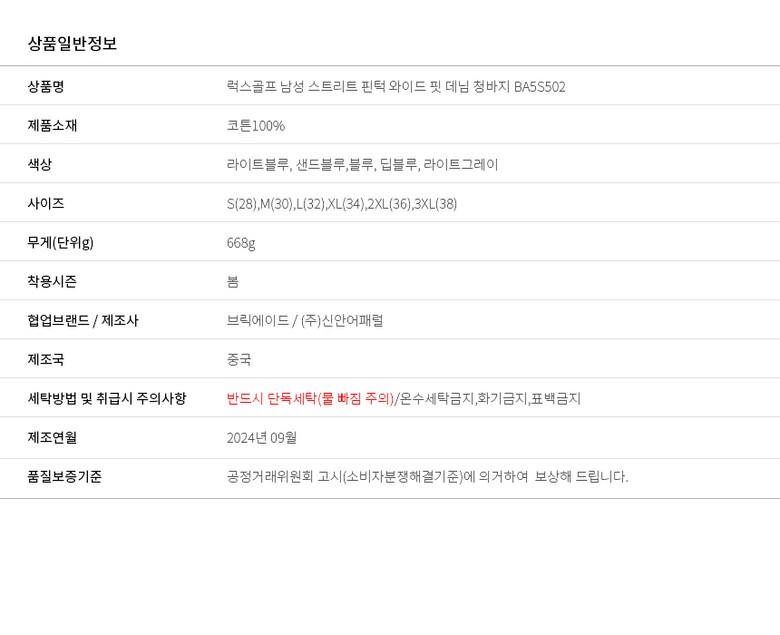 | 3. 치수 | S(28),M(30),L(32),XL(34),2XL(36),3XL(38) |