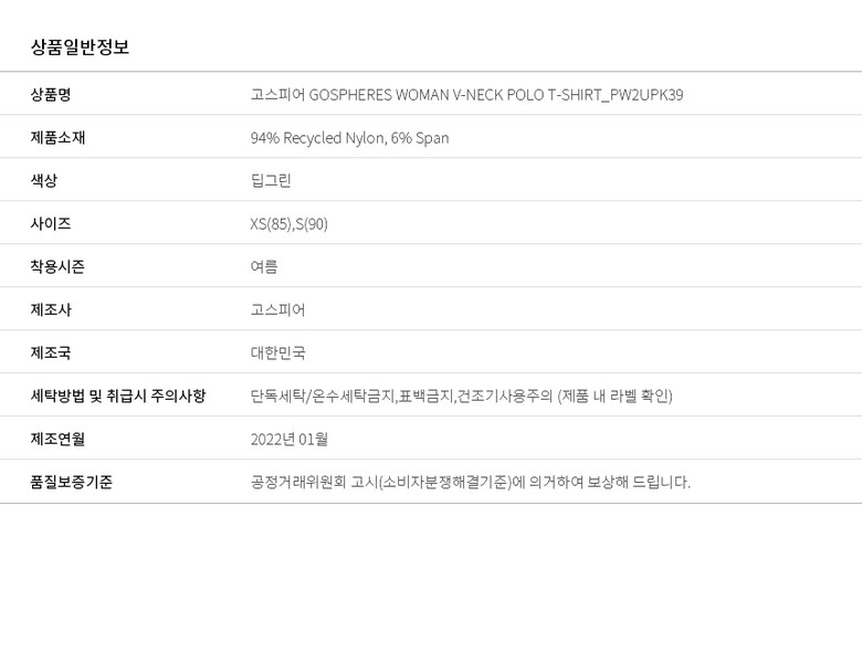 | 6. 세탁방법 및 취급시 주의사항 | 단독세탁/온수세탁금지,표백금지,건조기사용주의 (제품 내 라벨 확인) |