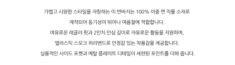 | 1. 제품 소재 (섬유의 조성 또는 혼용률을 백분율로 표시, 기능성인 경우 성적서 또는 허가서) | 100%면 |