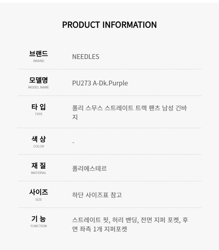 니들스 바지 PU273 A-Dk.Purple 폴리 스무스 스트레이트 트랙 남성바지 당일발송
