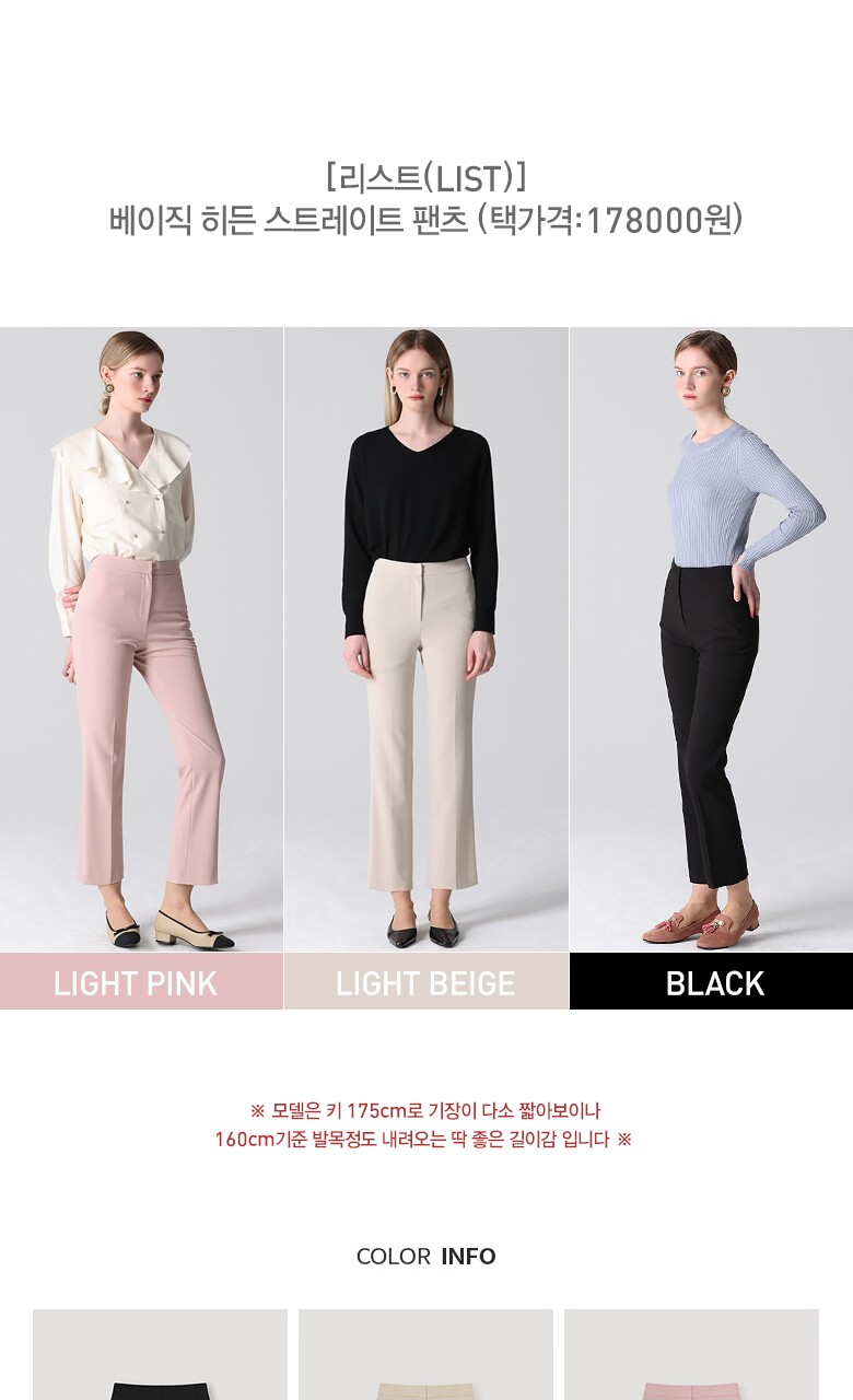 ▶ ITEM : 베이직 히든 스트레이트 팬츠 ▶ NUMBER : TWWSLN52060 ▶ FABRIC : 겉감:폴리에스터86%,폴리우레탄14% ▶ WASHING : 전문손세탁(필링주의) ▶ 원 산 지 : 베트남 ▶ 색 상 : 블랙(BK),라이트베이지(LB),라이트핑크(LP)
