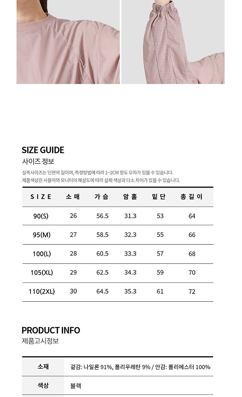 1. 제품 소재 (섬유의 조성 또는 혼용률을 백분율로 표시, 기능성인 경우 성적서 또는 허가서) | 겉감 : 나일론 91% 폴리우레탄 9%, 안감 : 폴리에스터 100% |
