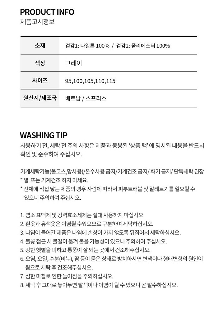 1. 제품 소재 (섬유의 조성 또는 혼용률을 백분율로 표시, 기능성인 경우 성적서 또는 허가서) 겉감1: 나일론 100%, 겉감2: 폴리에스터 100%