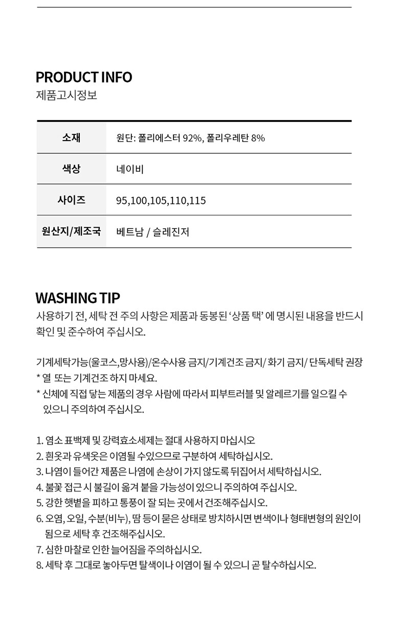 1. 제품 소재 (섬유의 조성 또는 혼용률을 백분율로 표시, 기능성인 경우 성적서 또는 허가서) | 겉감 : 폴리에스터 92%, 폴리우레탄 8% |