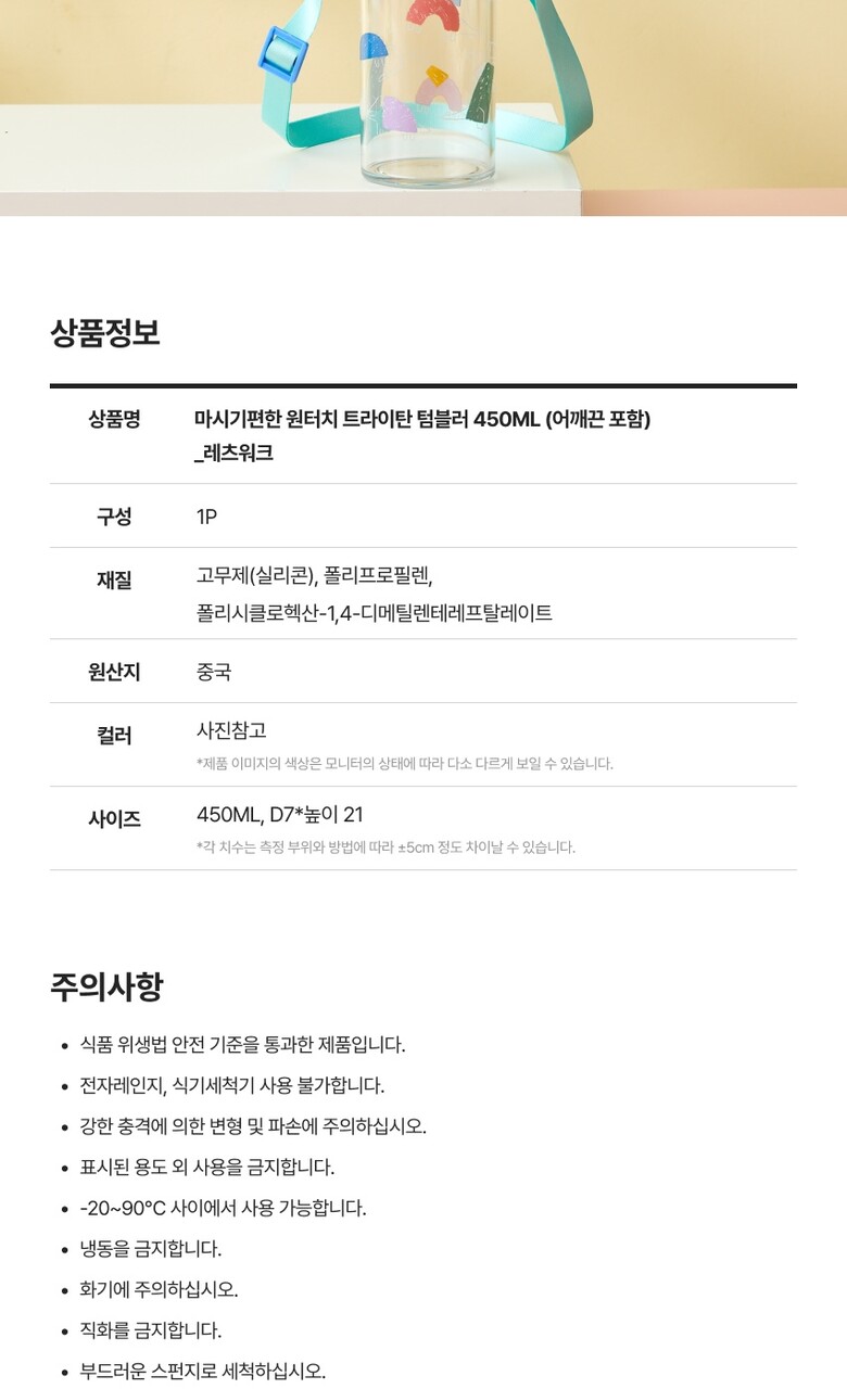 모던하우스 마시기편한 원터치 트라이탄 텀블러 450ML (어깨끈 포함)_레츠워크 KI0525007