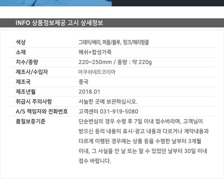 1. 제품 소재 (운동화인 경우에는 겉감, 안감을 구분하여 표시) | 상세페이지 참조 |