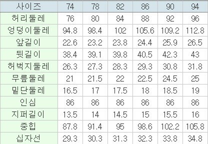 | 3. 치수 | 74(28~29),78(30~31),82(32~33),86(34~35),90(36),94(37~38) |