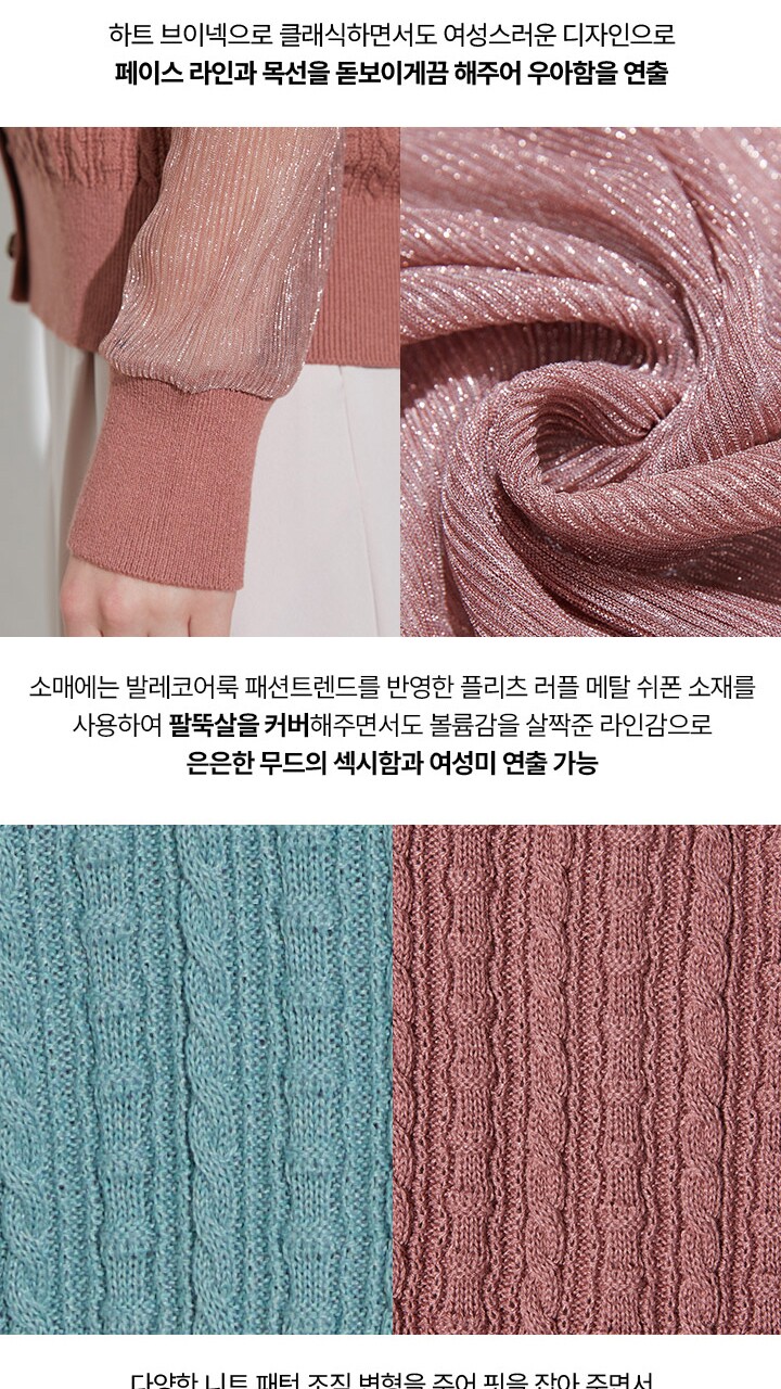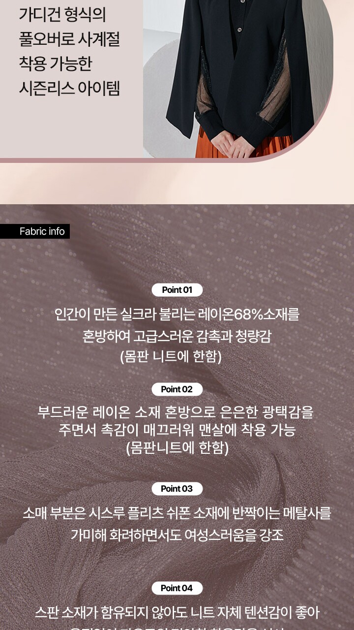 1. 제품 소재 (섬유의 조성 또는 혼용률을 백분율로 표시, 기능성인 경우 성적서 또는 허가서) | 겉감 : 레이온 68% 폴리에스터 32%, 배색 : 금속성섬유 54% 폴리에스터 46% |