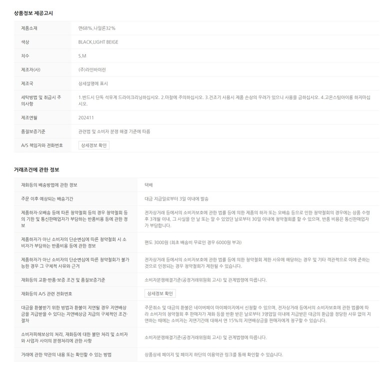 1. 제품 소재 (섬유의 조성 또는 혼용률을 백분율로 표시, 기능성인 경우 성적서 또는 허가서) 상품상세참조