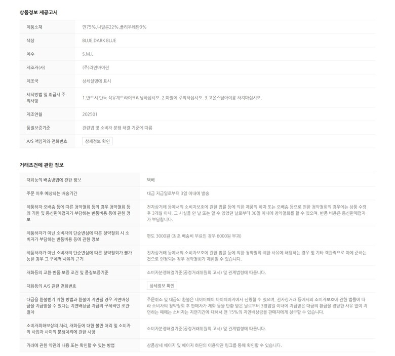 | 1. 제품 소재 (섬유의 조성 또는 혼용률을 백분율로 표시, 기능성인 경우 성적서 또는 허가서) | 상품상세참조 |