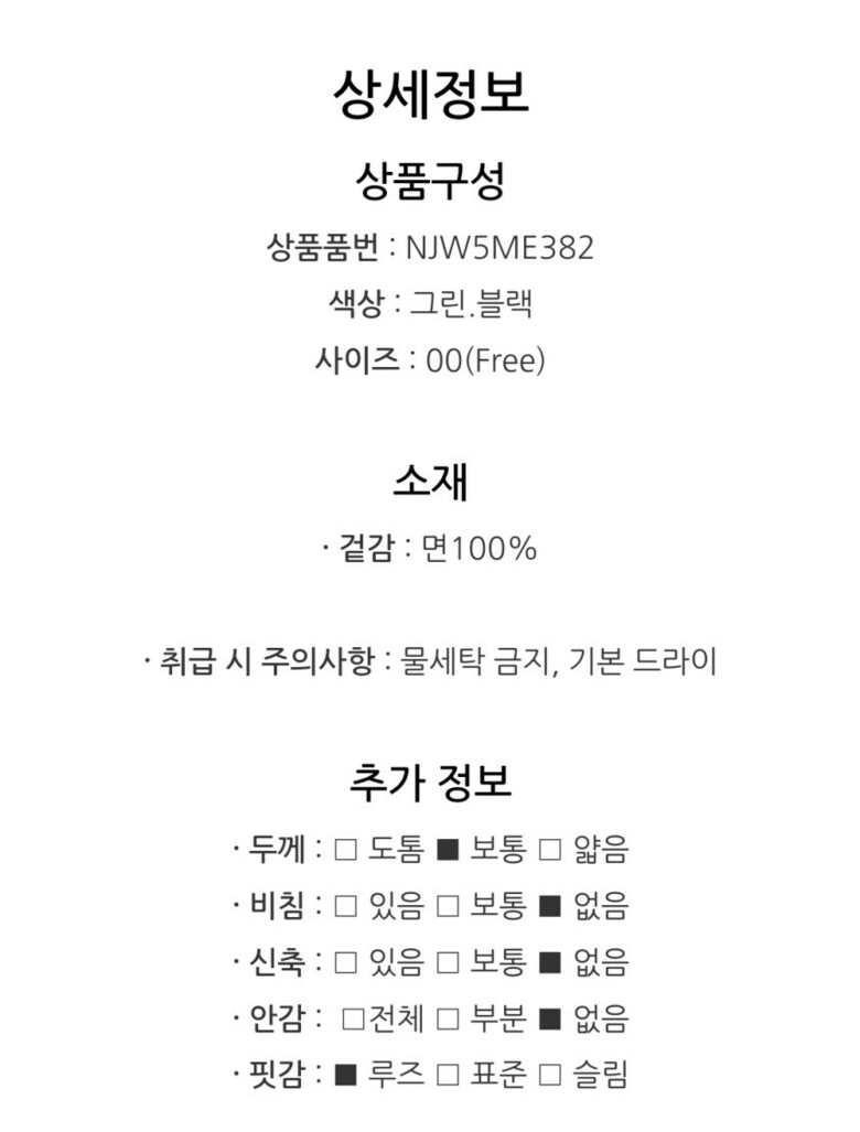 | 1. 제품 소재 (섬유의 조성 또는 혼용률을 백분율로 표시, 기능성인 경우 성적서 또는 허가서) | 상품상세참조 |