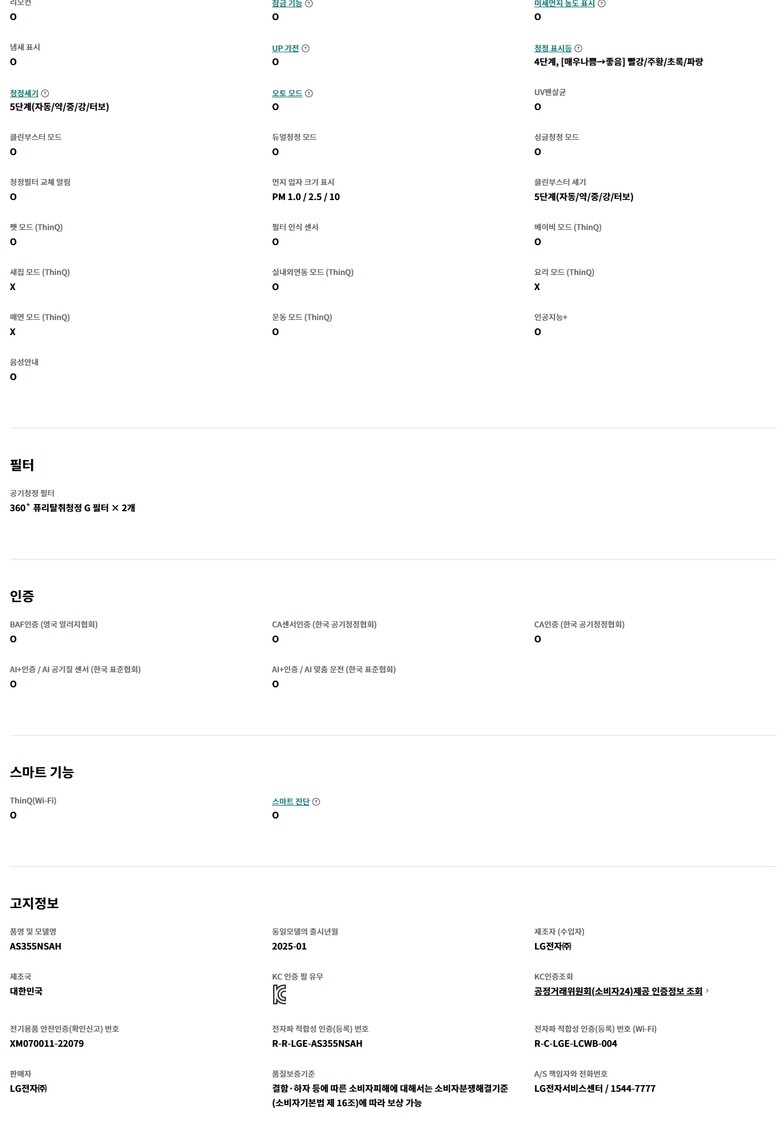 LG 퓨리케어 오브제컬렉션 360공기청정기 AS355NSAHM (무빙휠 포함)