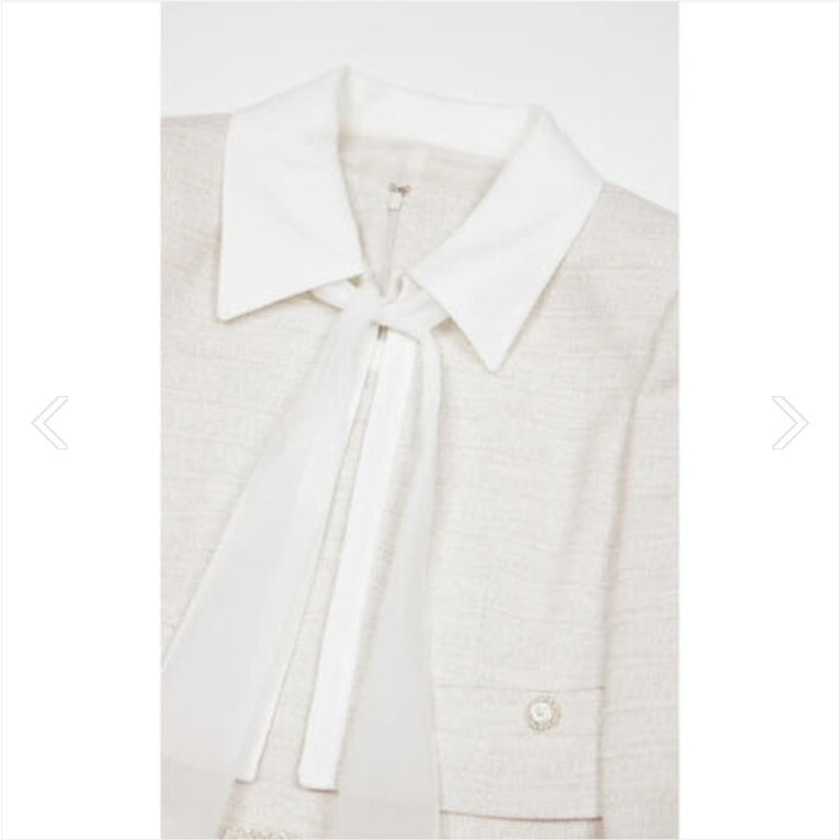 자켓 넥라인에 탈착 가능한 리본 타이를 묶어 포인트를 줄 수 있습니다.