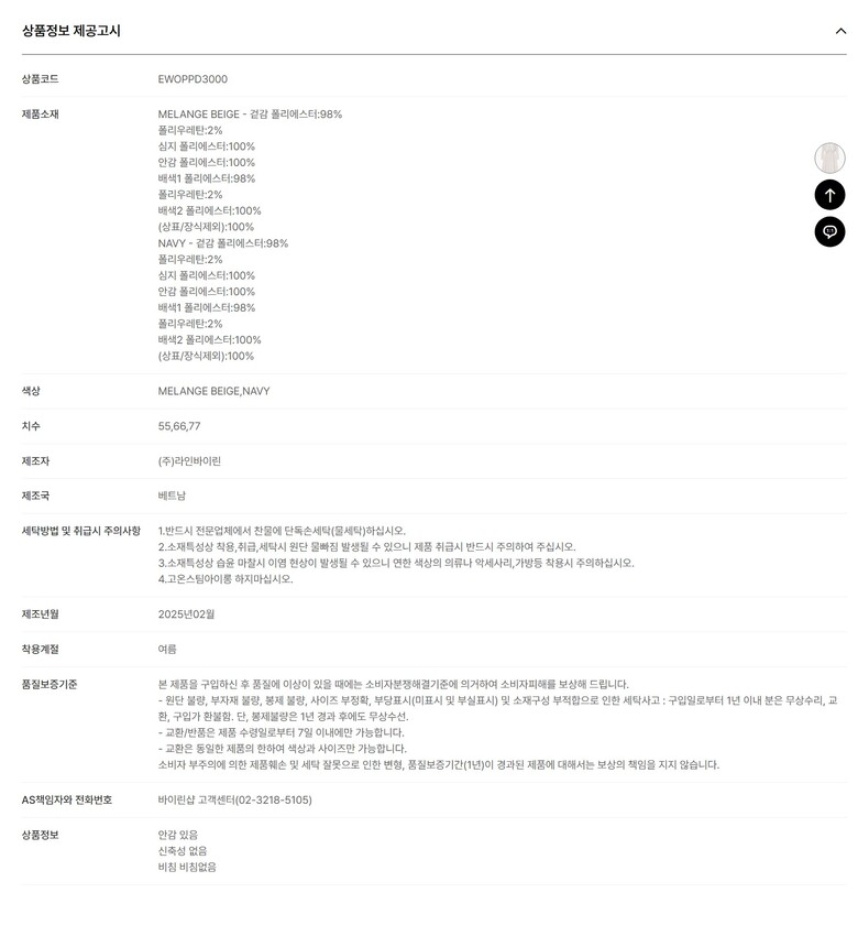 1. 제품 소재 (섬유의 조성 또는 혼용률을 백분율로 표시, 기능성인 경우 성적서 또는 허가서) 상품상세참조