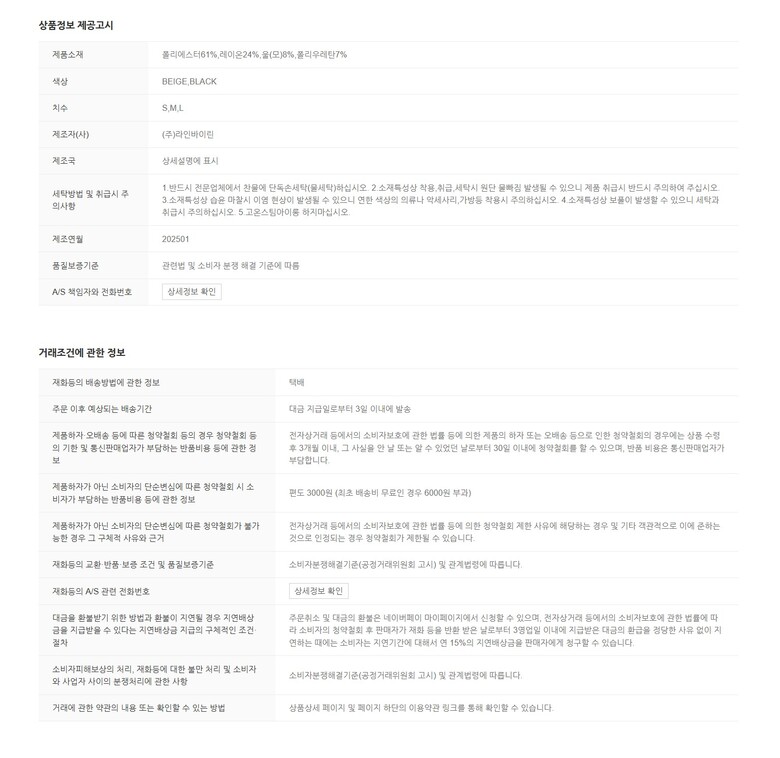 | 6. 세탁방법 및 취급시 주의사항 | 상품상세참조 |