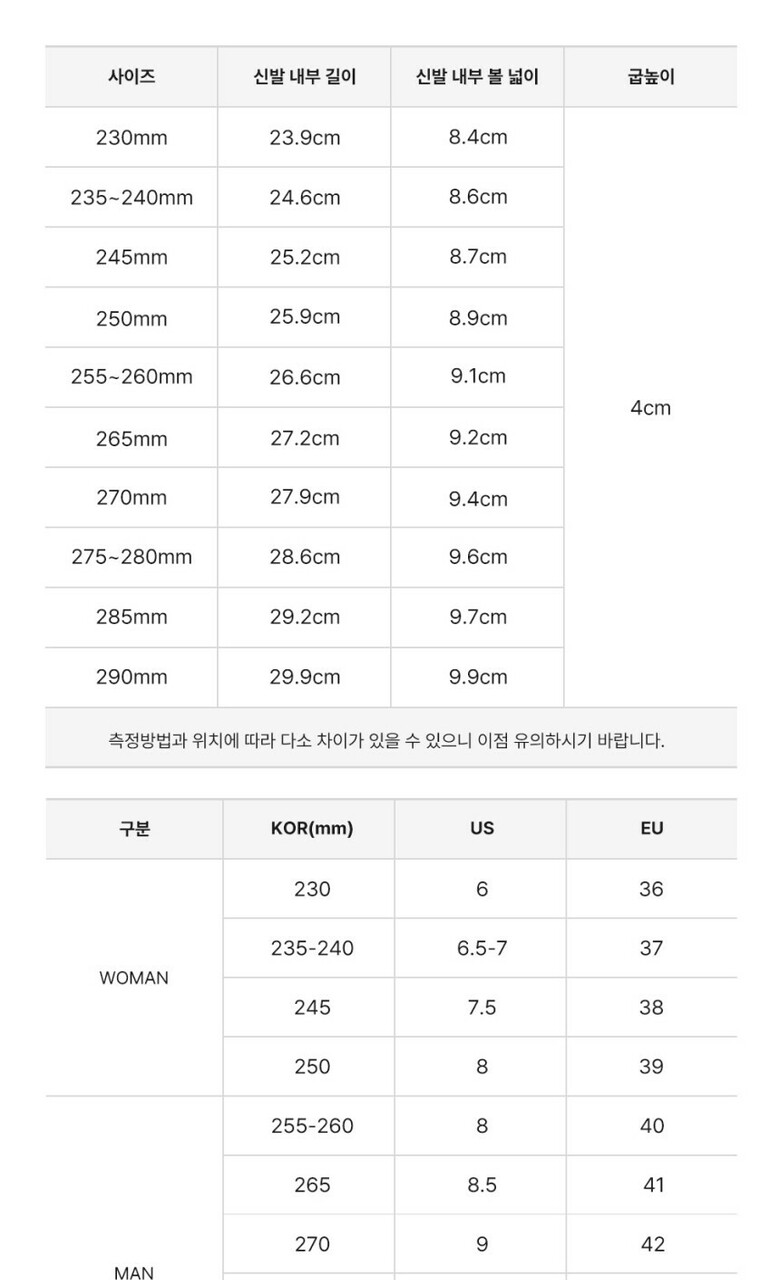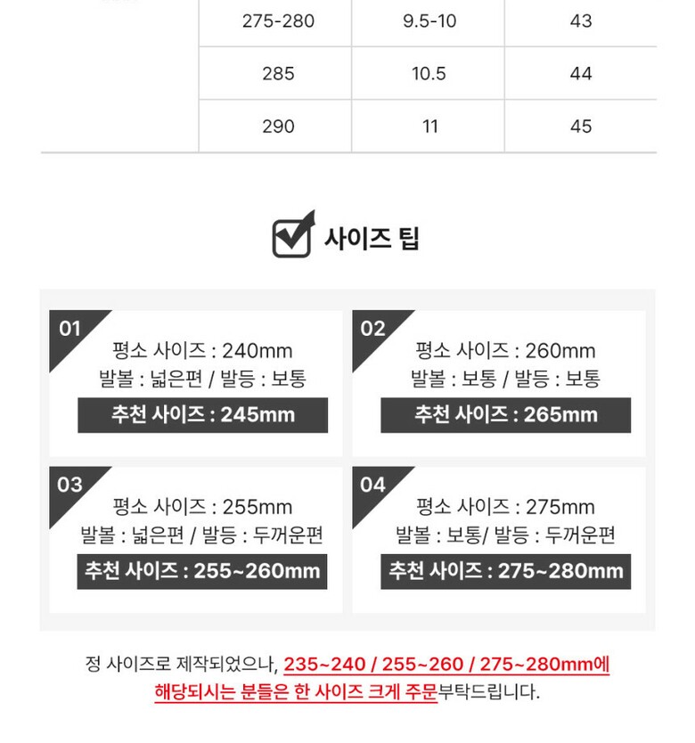 | 3. 치수 | 230mm,235~240mm,245mm,250mm,255~260mm,265mm,270mm,275~280mm |
