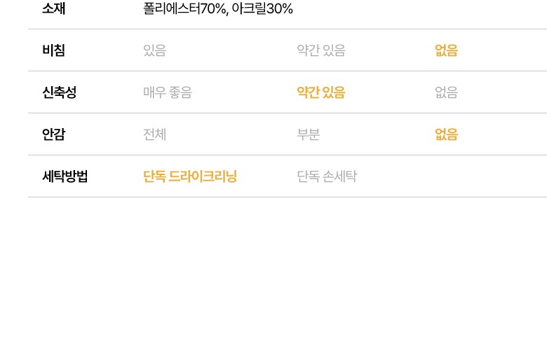 1. 제품 소재 (섬유의 조성 또는 혼용률을 백분율로 표시, 기능성인 경우 성적서 또는 허가서) | 폴리에스터70%, 아크릴30% |