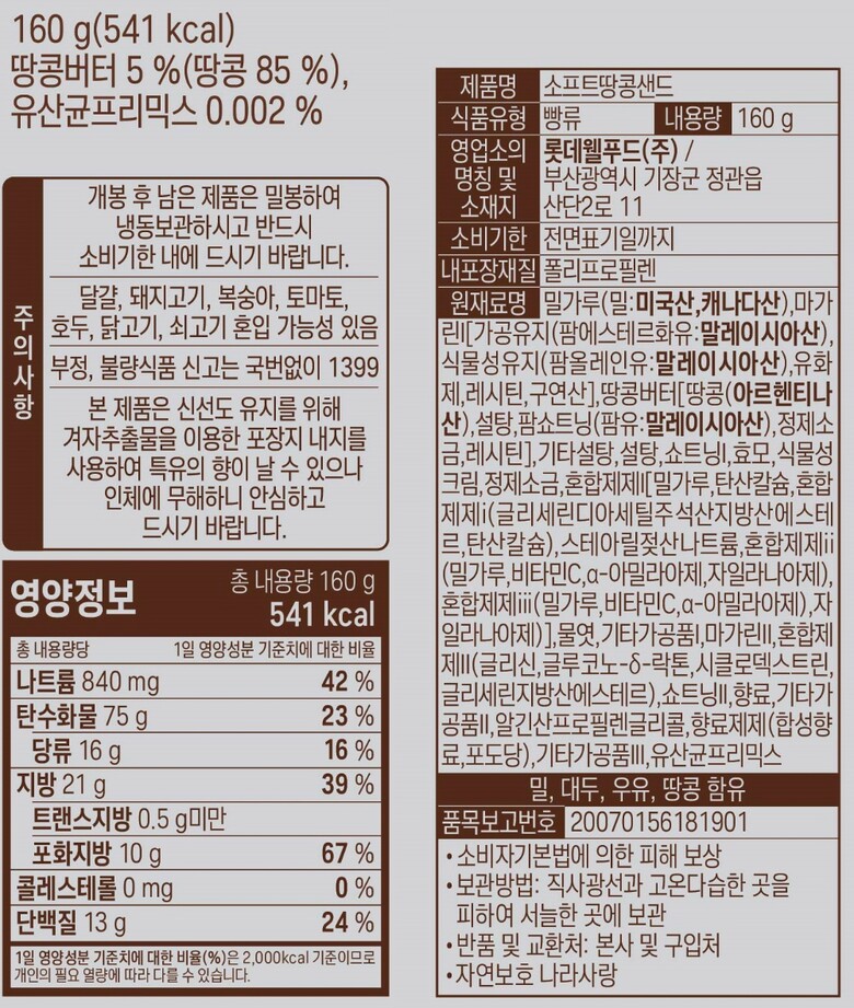 #롯데 #롯데제과 #롯데웰푸드 #베이커리 #기린이네 #소프트 #땅콩 #샌드 #160g #빵