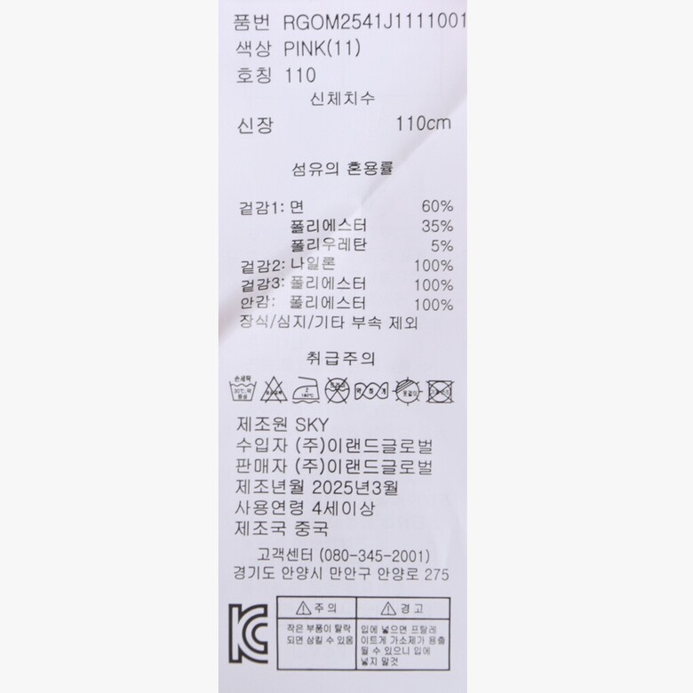 | 1. 제품 소재 (섬유의 조성 또는 혼용률을 백분율로 표시, 기능성인 경우 성적서 또는 허가서) | 상품상세참조 |