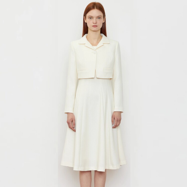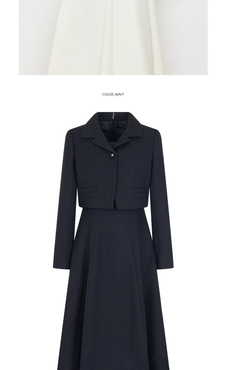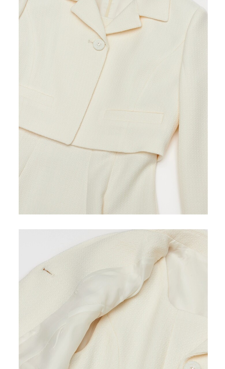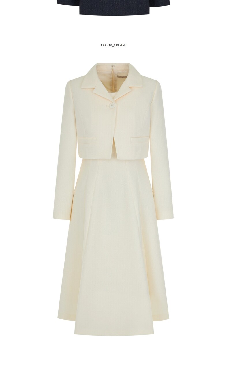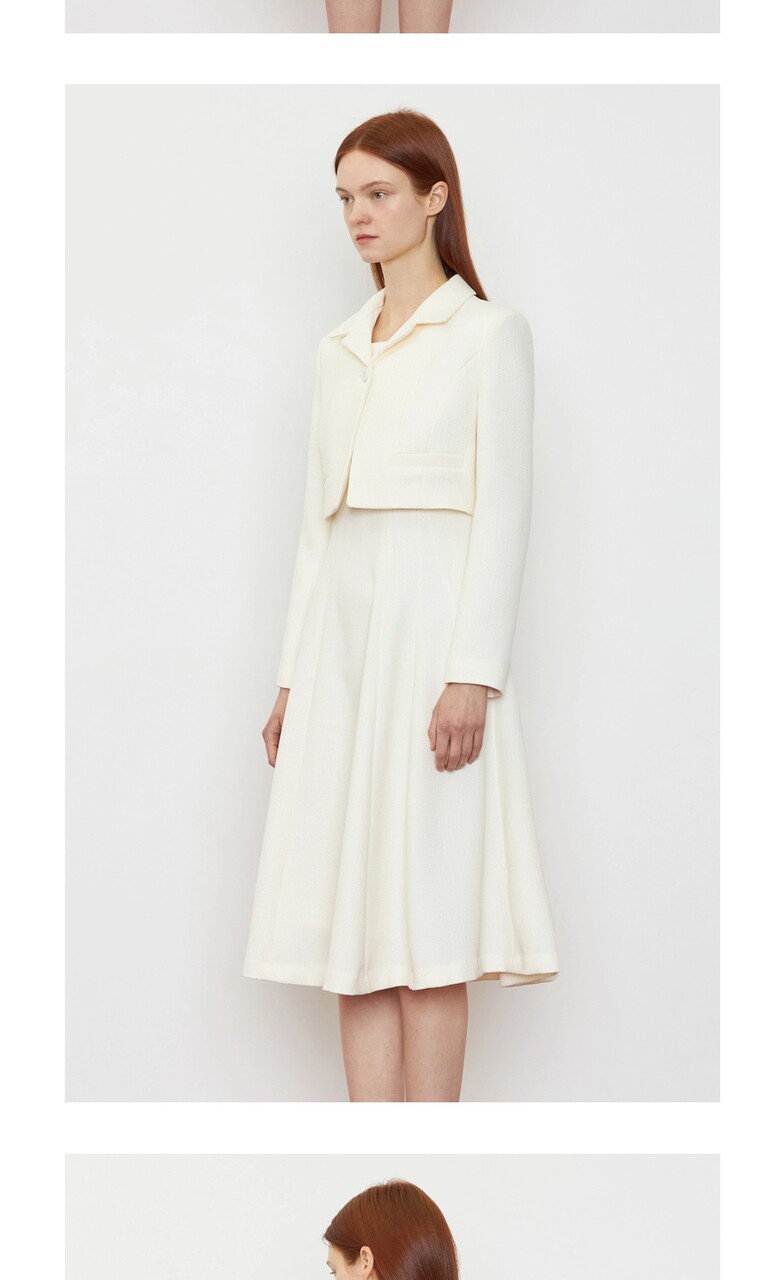 원버튼 크롭 자켓과 미디 기장의 원피스를 레이어드하여 착용한 듯한 디자인이 매력적인 원피스입니다.