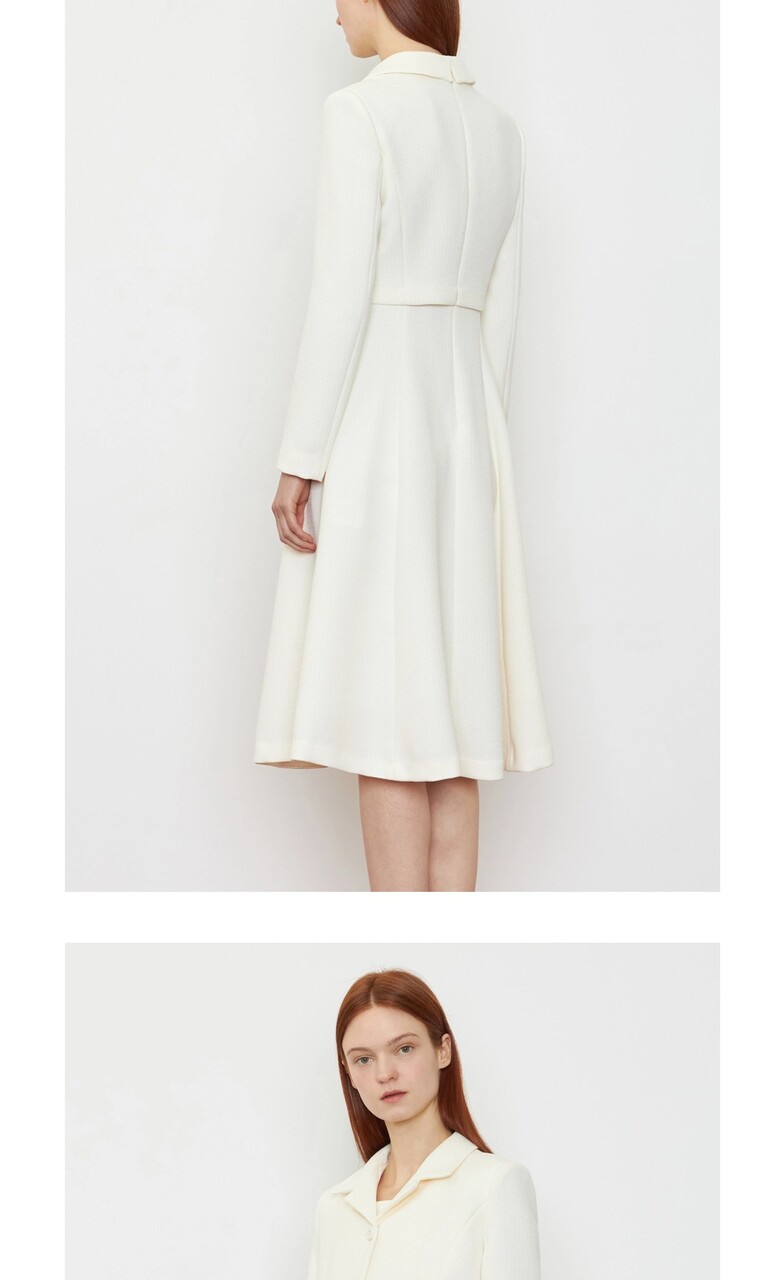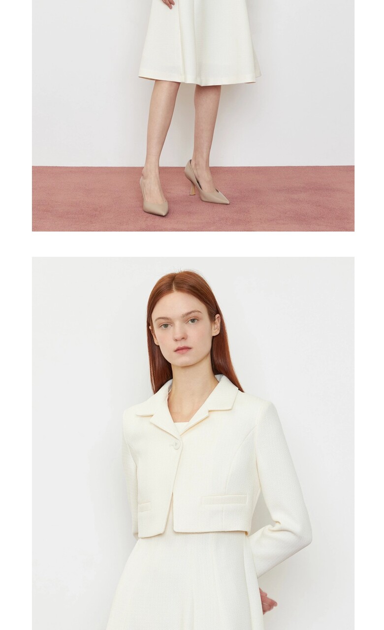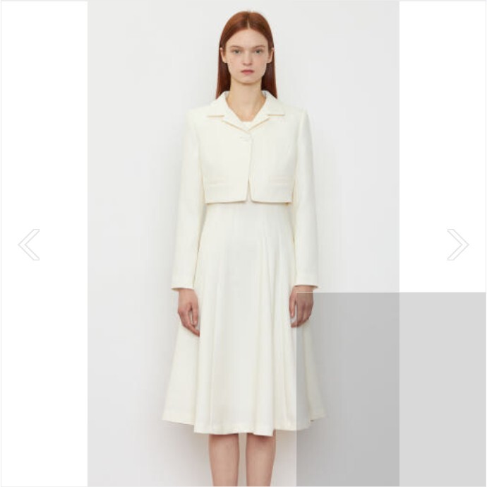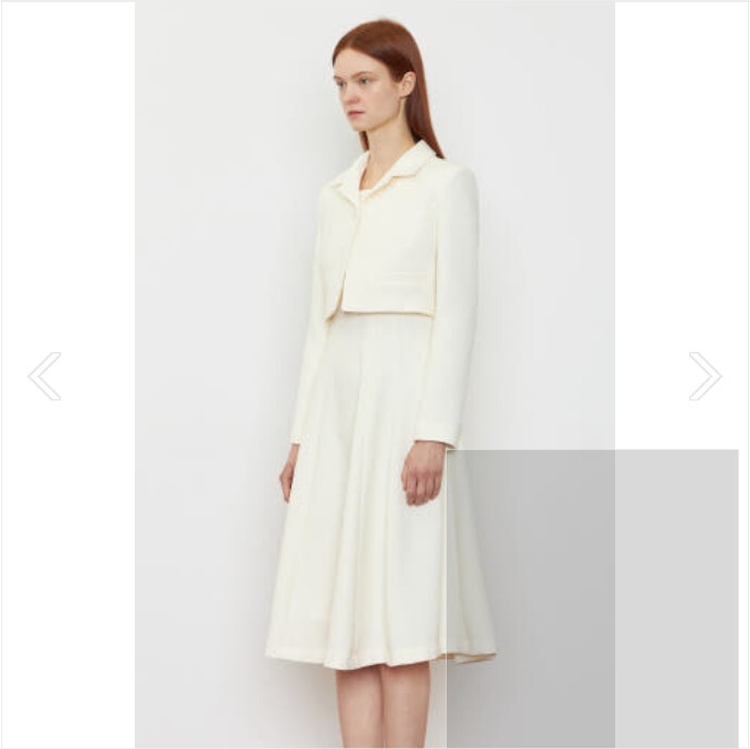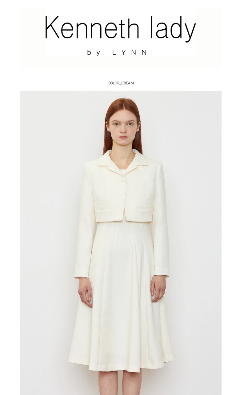 원버튼 크롭 자켓과 미디 기장의 원피스를 레이어드하여 착용한 듯한 디자인이 매력적인 원피스입니다.