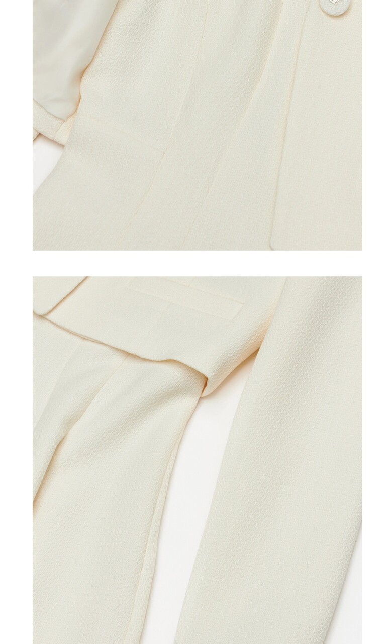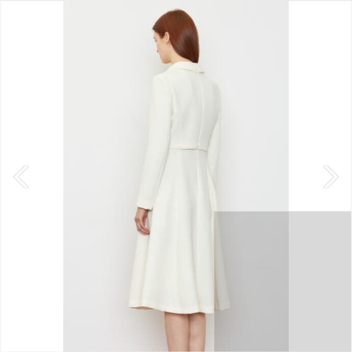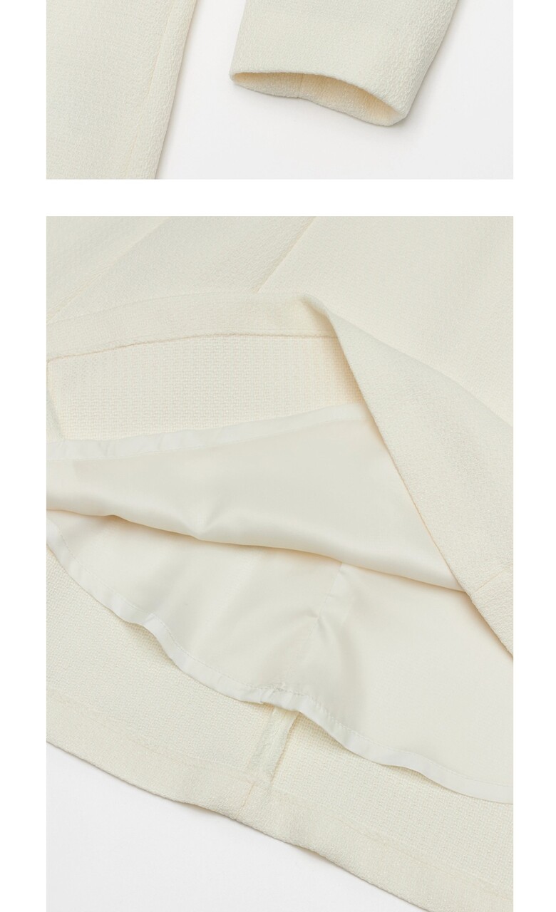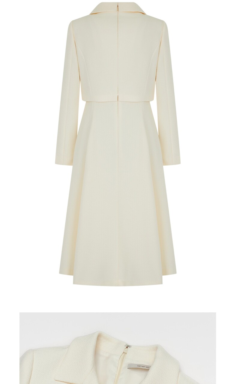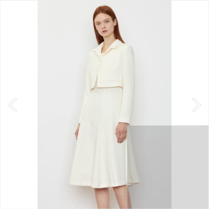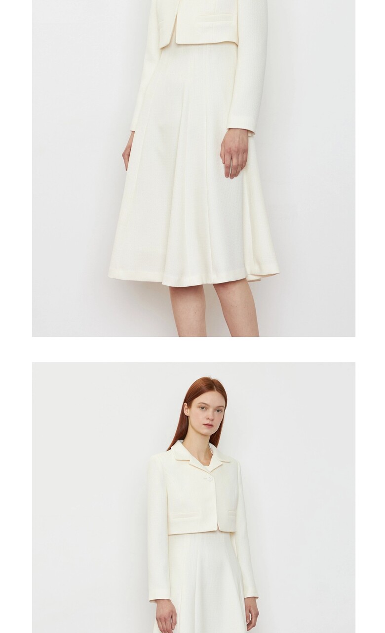 원버튼 크롭 자켓과 미디 기장의 원피스를 레이어드하여 착용한 듯한 디자인이 매력적인 원피스입니다.