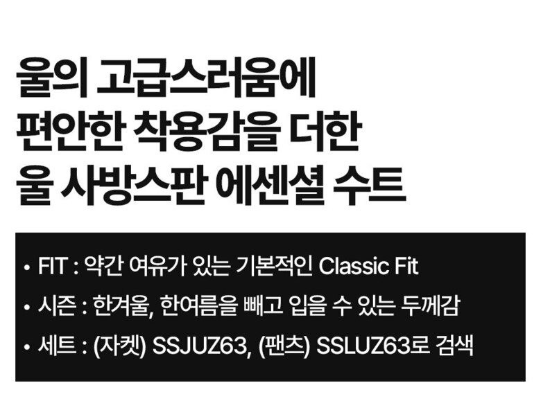 1. 제품 소재 (섬유의 조성 또는 혼용률을 백분율로 표시, 기능성인 경우 성적서 또는 허가서) 겉감 : 폴리에스터(57%), 모(양모)(37%), 폴리우레탄(6%) 안감 : 폴리에스터(100%)