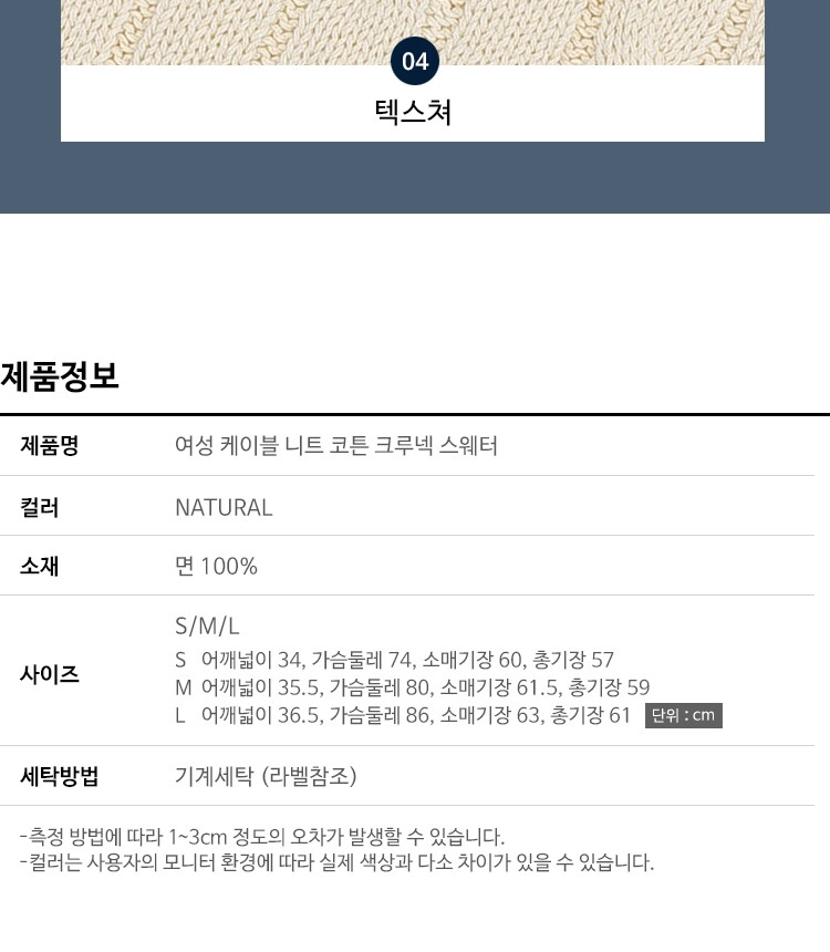 3. 치수 | S사이즈기준실측 : 어깨넓이 34cm, 가슴둘레 74cm, 팔길이 60cm, 총길이 57cm |