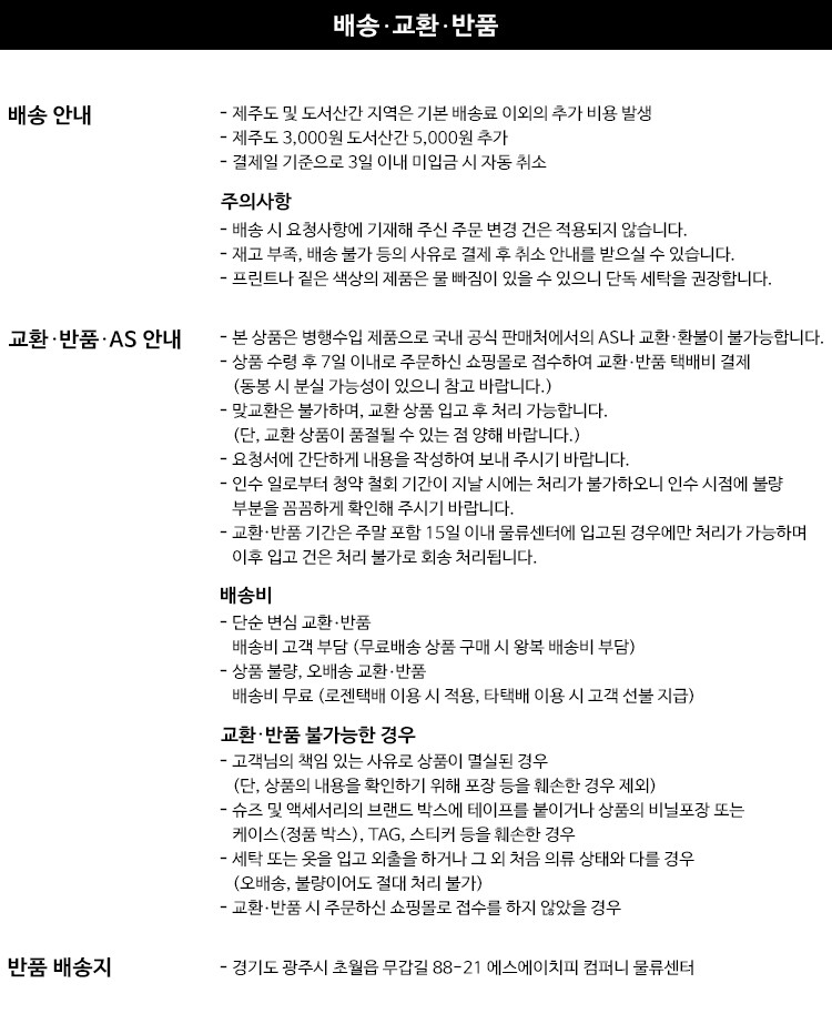 상품불량에 의한 반품, A/S, 품질보증 및 피해보상 등에 관한 사항은 소비자 분쟁해결기준(공정거래위원회 고시) 구매자가 미성년자인 경우에는 상품 구입시 법정대리인이 동의하지 아니하면 미성년자 본인 또는 법정대리인이 구매취소 할 수 있습니다. |