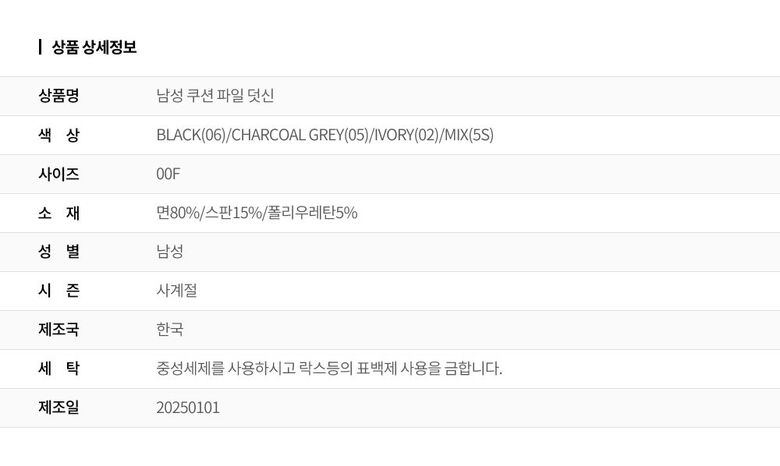 | 2. 소재 | 면80%/스판15%/폴리우레탄5% |