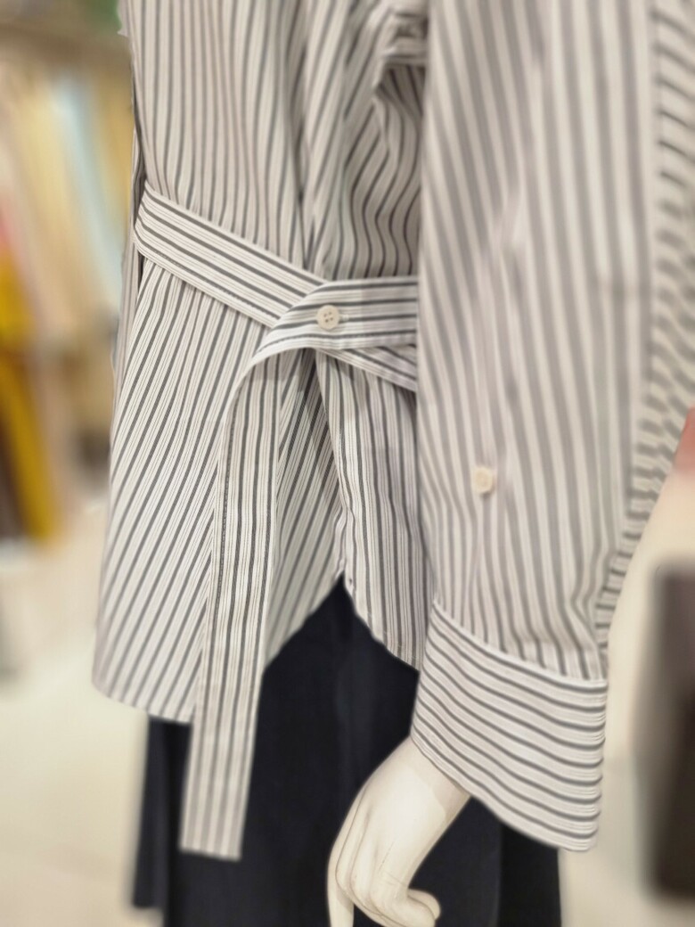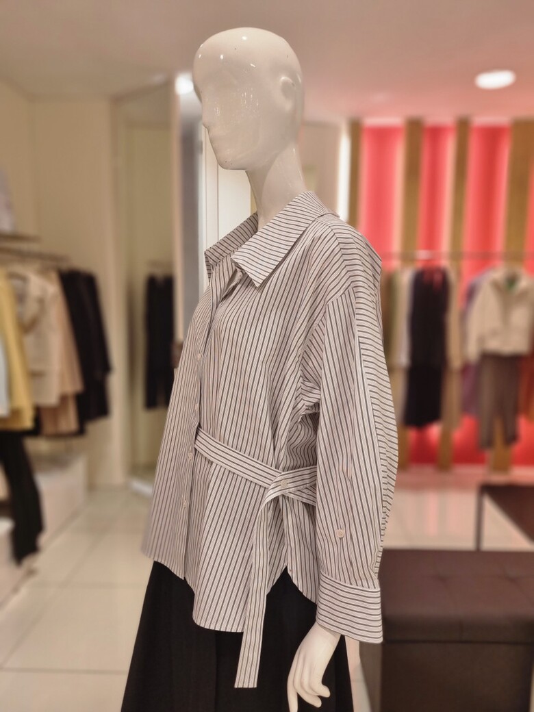 허리라인 끈벨트 연출되는 핀턱이있는 세련된 셔츠입니다.