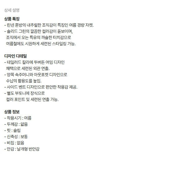 | 1. 제품 소재 (섬유의 조성 또는 혼용률을 백분율로 표시, 기능성인 경우 성적서 또는 허가서) | 상품상세참조 |