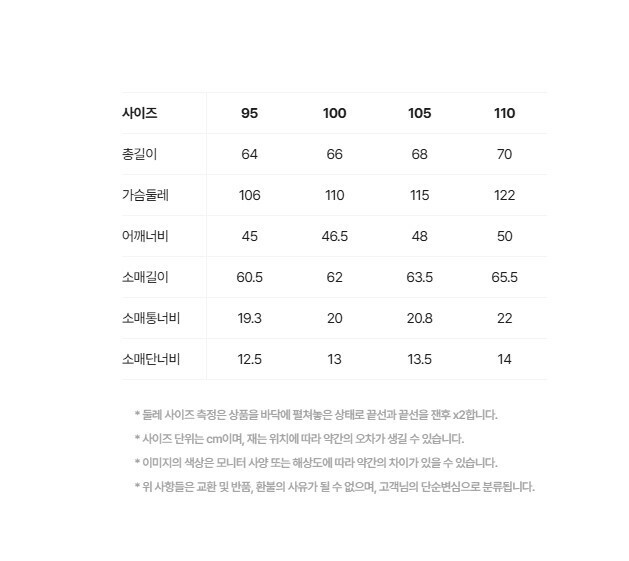 | 1. 제품 소재 (섬유의 조성 또는 혼용률을 백분율로 표시, 기능성인 경우 성적서 또는 허가서) | 상품상세참조 |