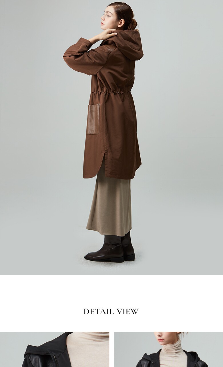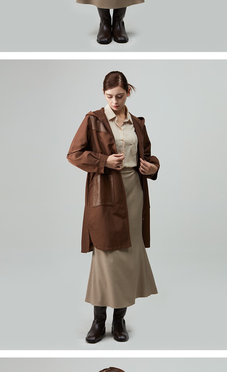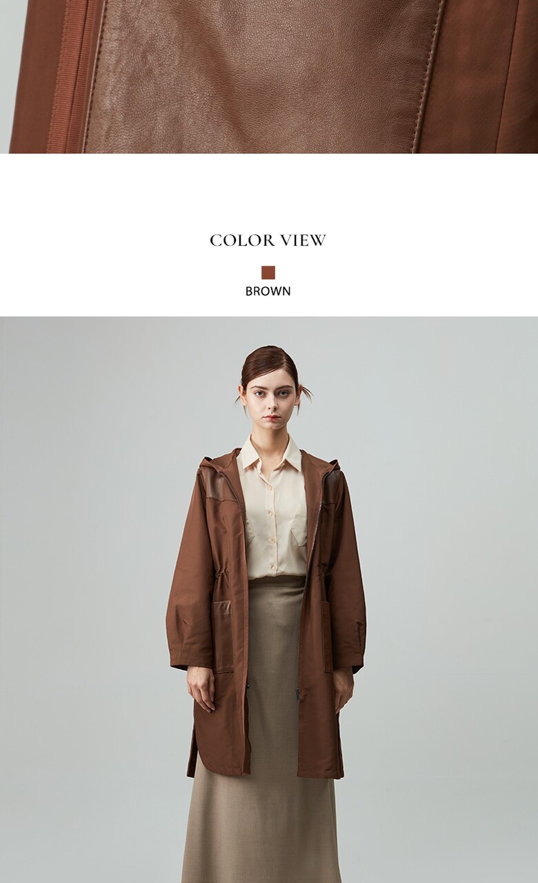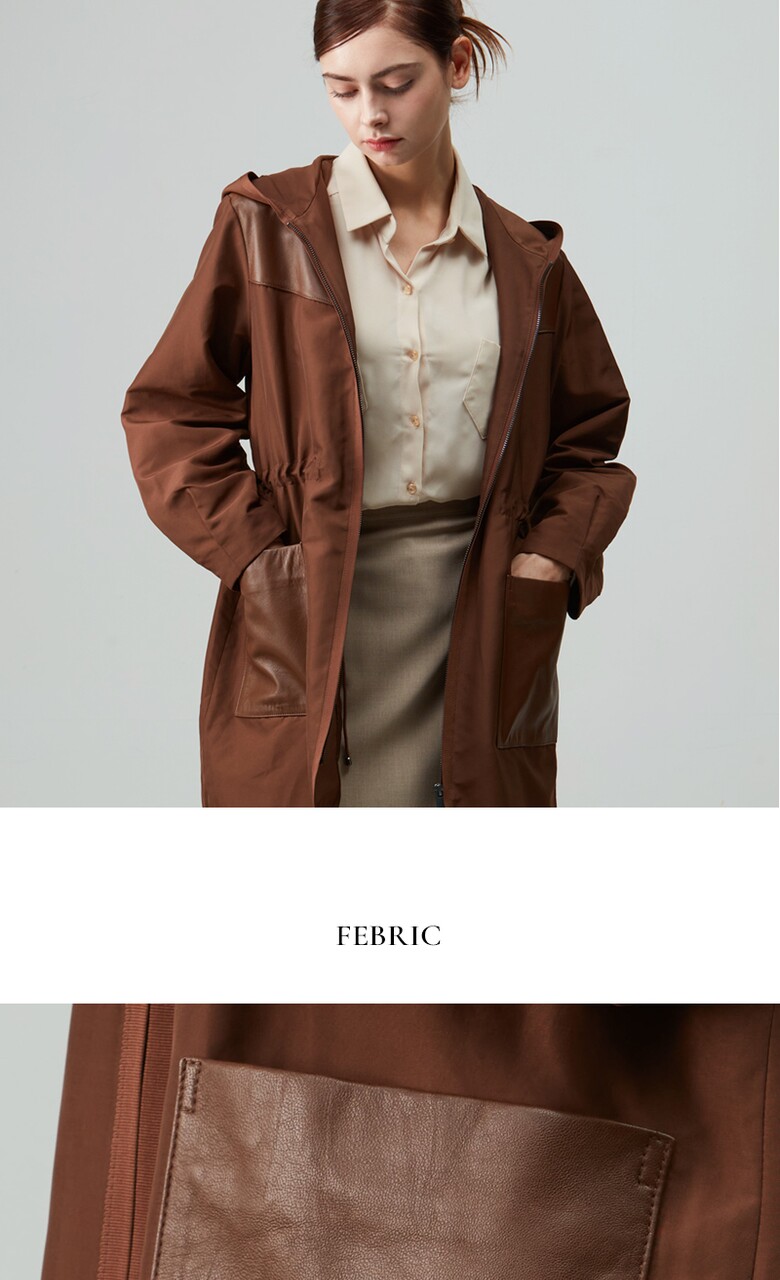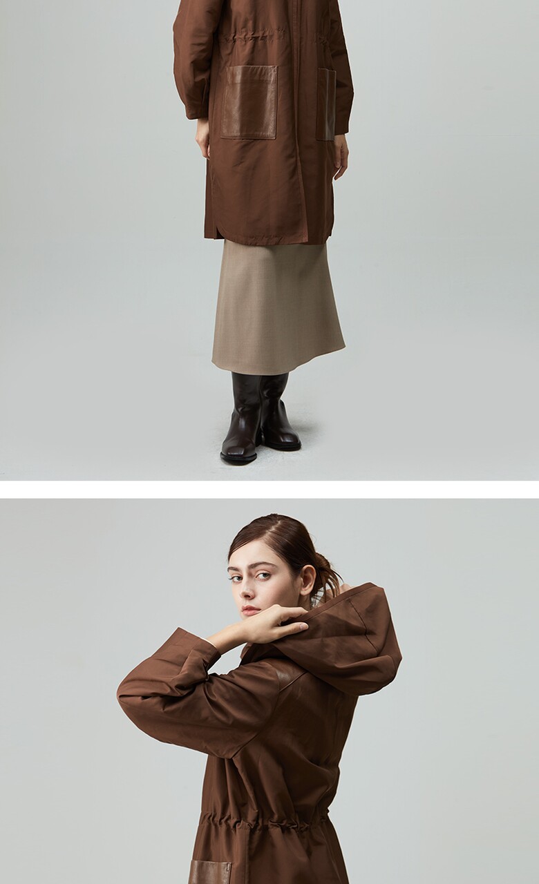 후스타일 여성 레더 믹스 후드 롱 집업 코트 브라운
