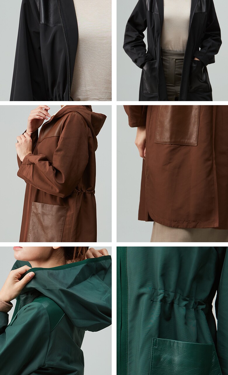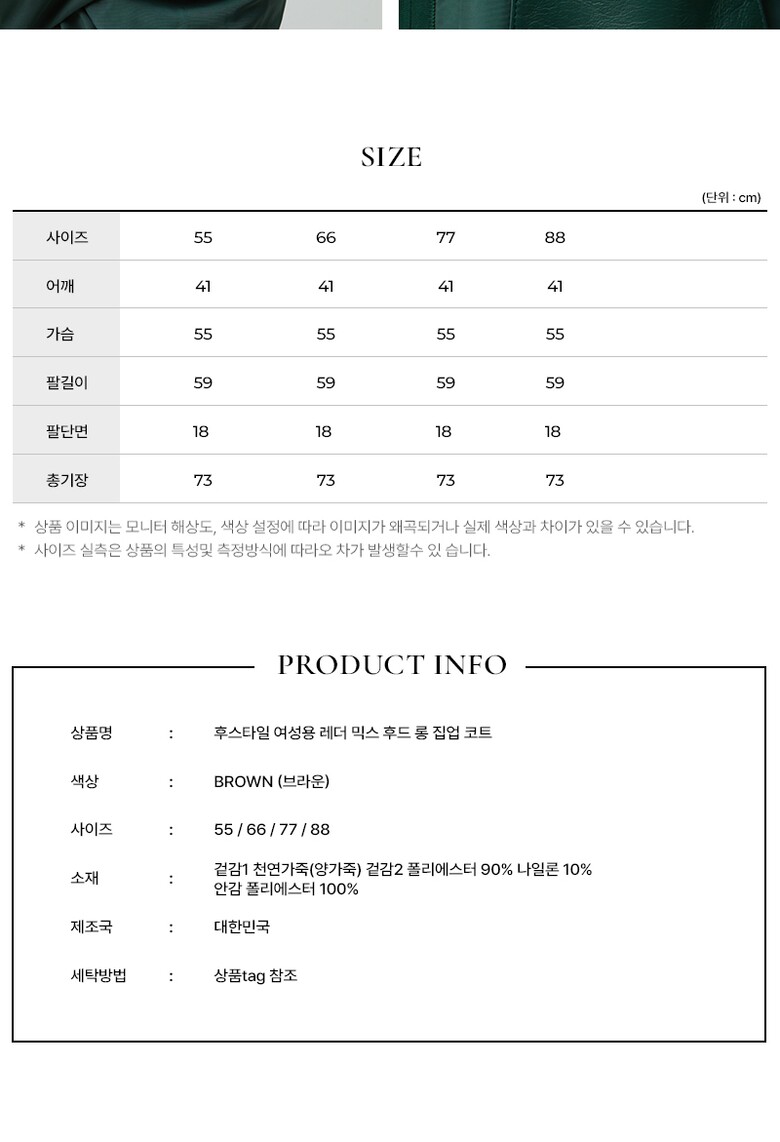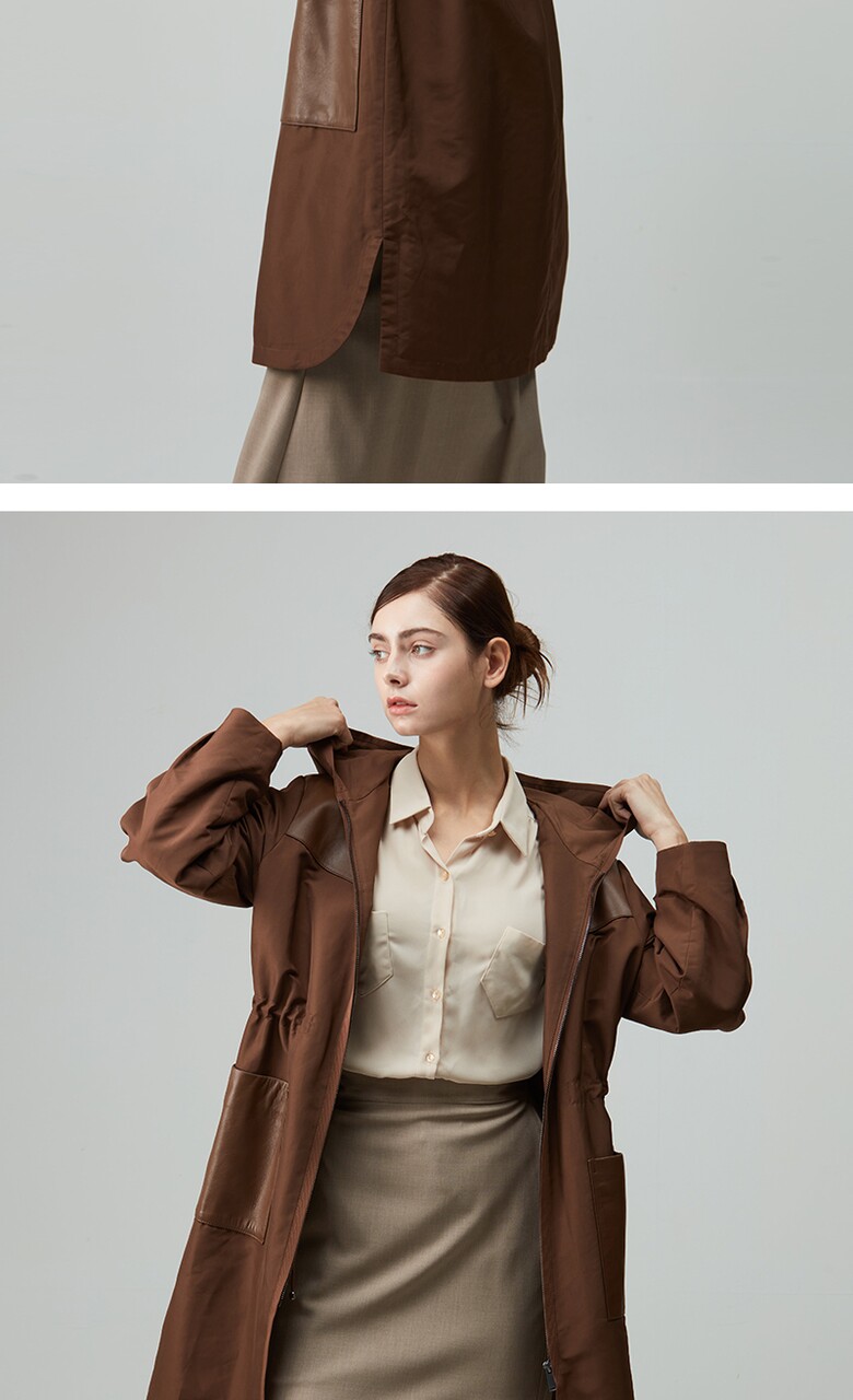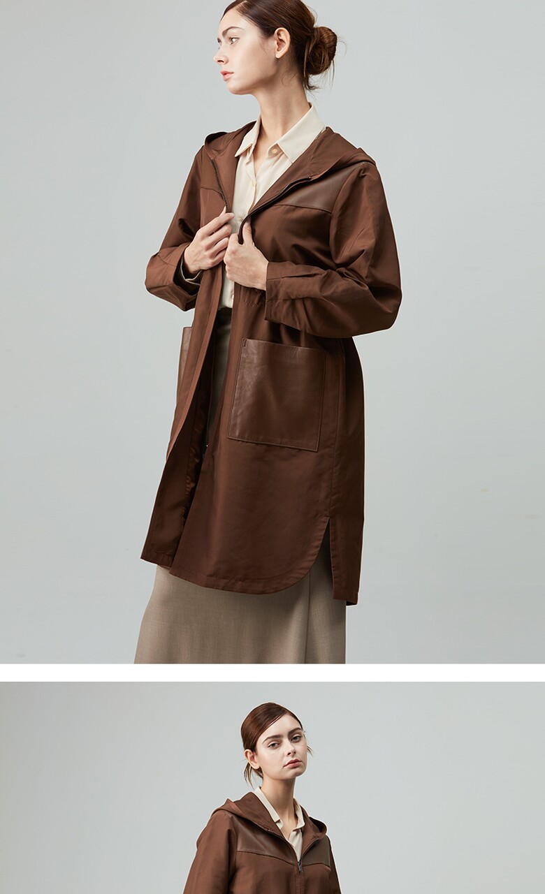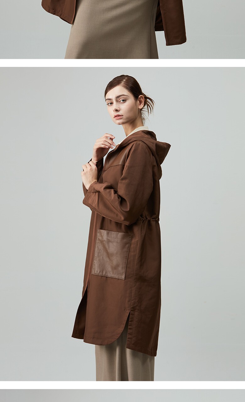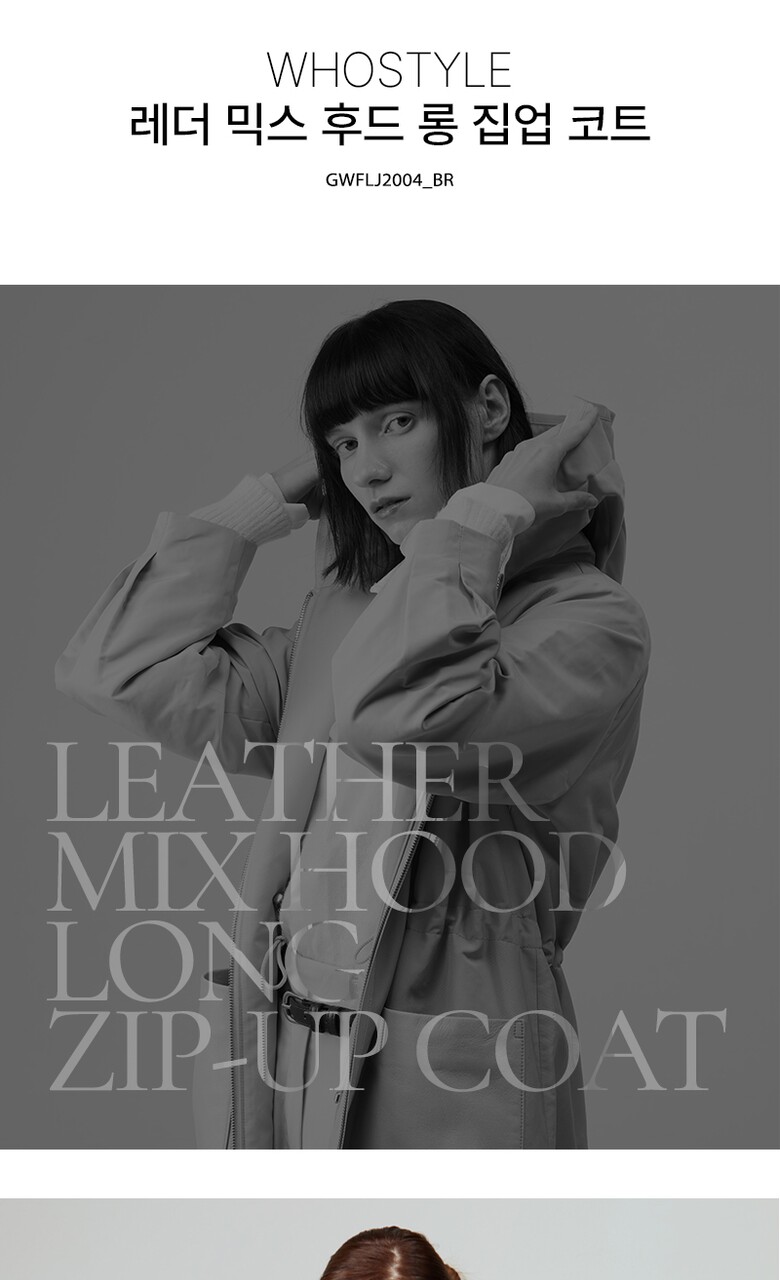후스타일 여성 레더 믹스 후드 롱 집업 코트 브라운
