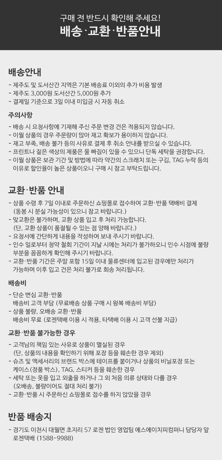 상품불량에 의한 반품, A/S, 품질보증 및 피해보상 등에 관한 사항은 소비자 분쟁해결기준(공정거래위원회 고시) 구매자가 미성년자인 경우에는 상품 구입시 법정대리인이 동의하지 아니하면 미성년자 본인 또는 법정대리인이 구매취소 할 수 있습니다. |
