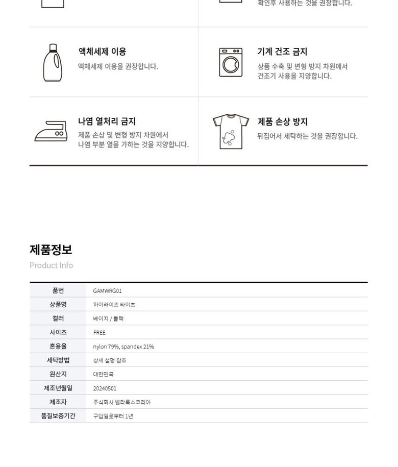 1. 제품 소재 (섬유의 조성 또는 혼용률을 백분율로 표시, 기능성인 경우 성적서 또는 허가서) | 나일론 79% 스판 21% |