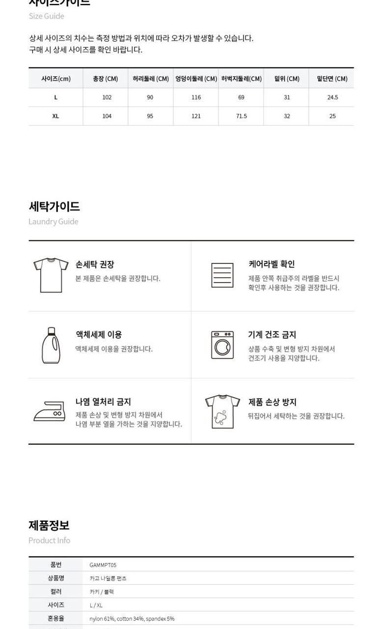 1. 제품 소재 (섬유의 조성 또는 혼용률을 백분율로 표시, 기능성인 경우 성적서 또는 허가서) 나일론 61%, 면 34%, 스판 5%