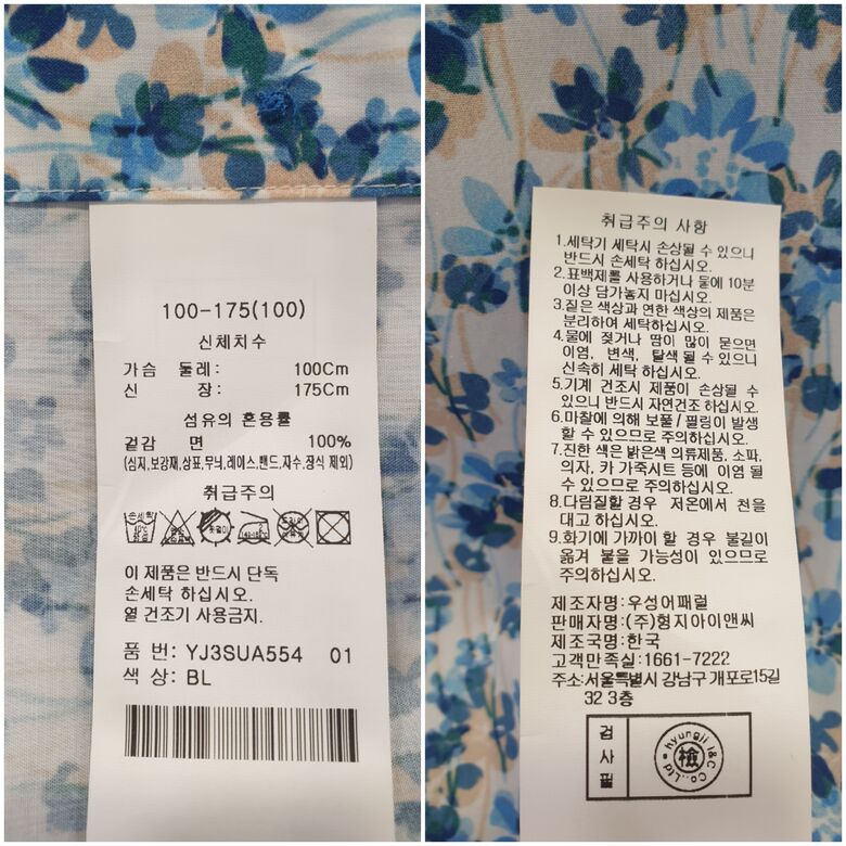 • 처음 배송된 상품상태와 다를 경우(세탁/착용 후 외출하신 경우) 반품이 불가합니다.
