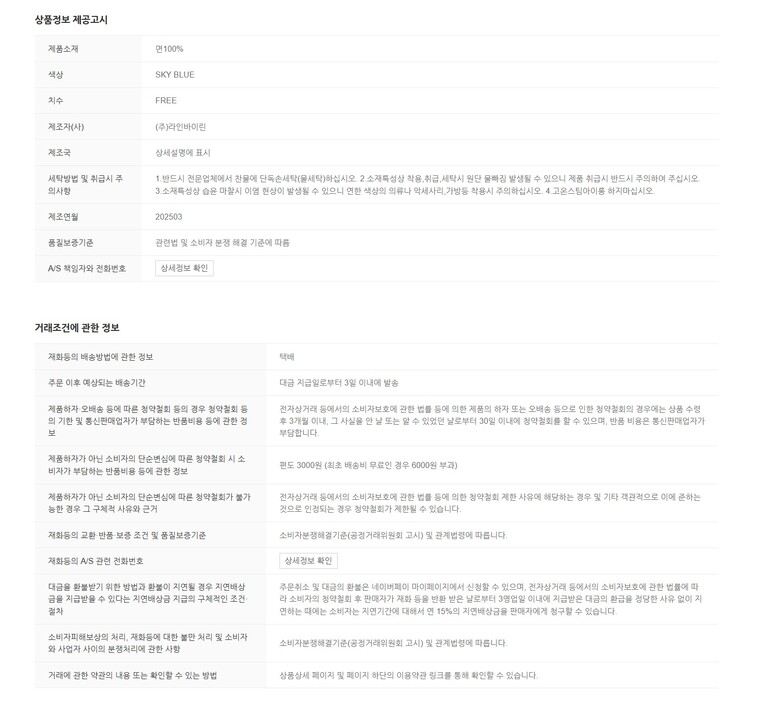 | 1. 제품 소재 (섬유의 조성 또는 혼용률을 백분율로 표시, 기능성인 경우 성적서 또는 허가서) | 상품상세참조 |