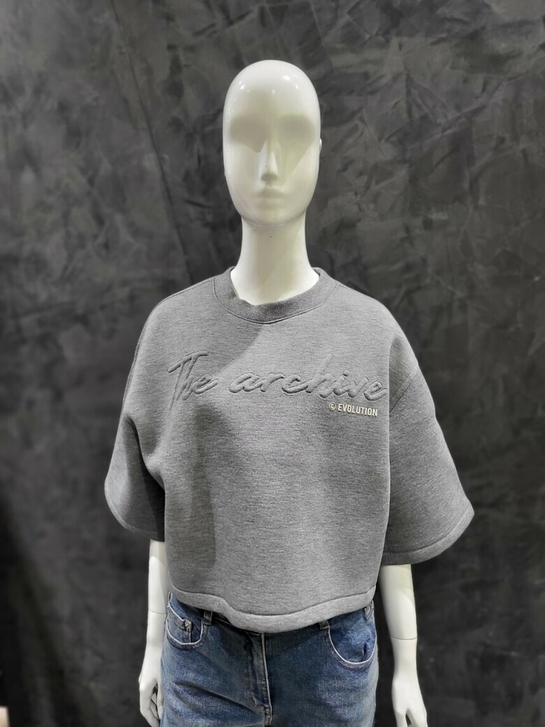 크롭 기장감에 드롭숄더로 여유로운 하프슬리브 실루엣이며,