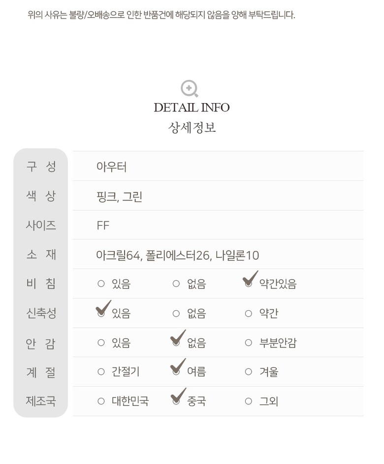 1. 제품 소재 (섬유의 조성 또는 혼용률을 백분율로 표시, 기능성인 경우 성적서 또는 허가서) | 상세페이지 참조 |