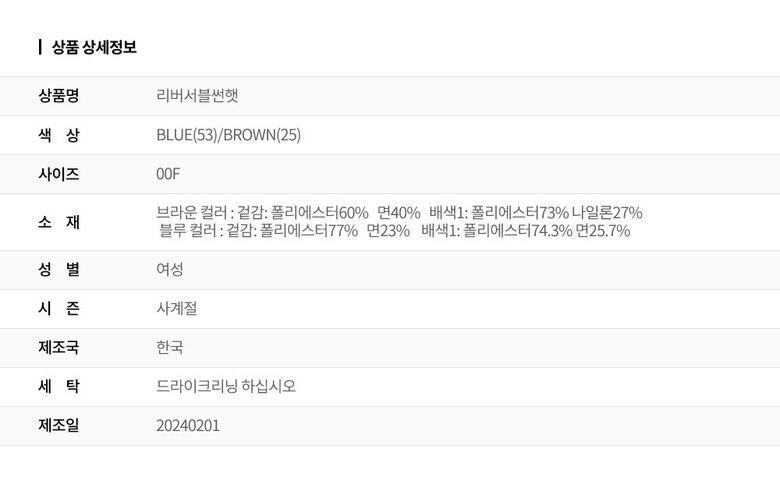 2. 소재 브라운 컬러 : 겉감: 폴리에스터60% 면40% 배색1: 폴리에스터73% 나일론27% / 블루 컬러 : 겉감: 폴리에스터77% 면23%