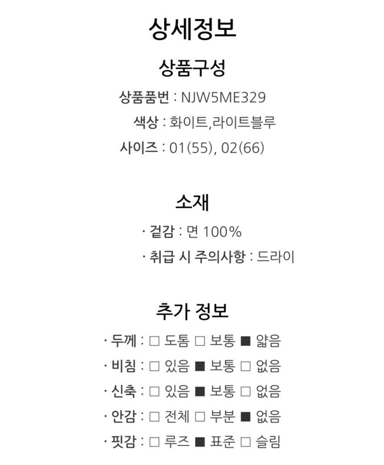 | 1. 제품 소재 (섬유의 조성 또는 혼용률을 백분율로 표시, 기능성인 경우 성적서 또는 허가서) | 상품상세참조 |