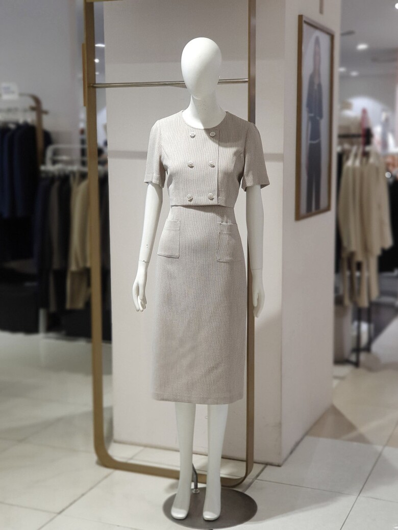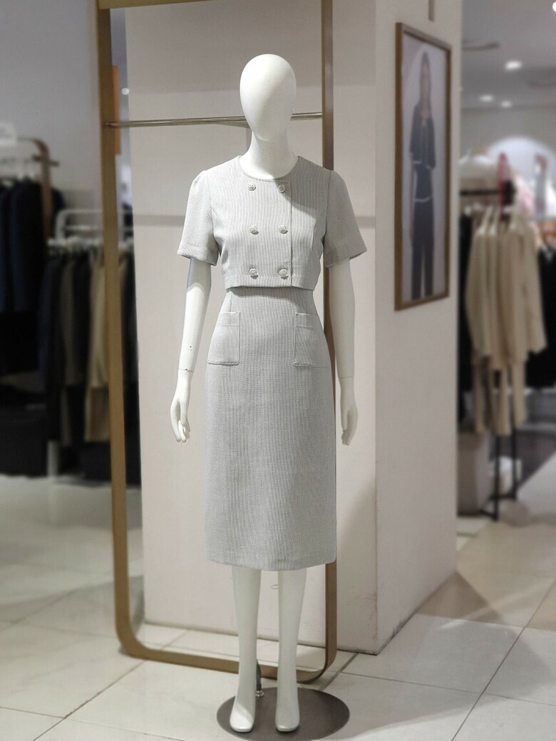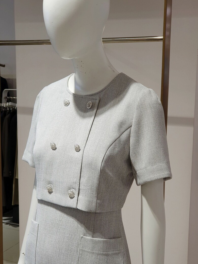 크롭 재킷 디자인의 상의에 더블 버튼 장식으로 포인트를 주며