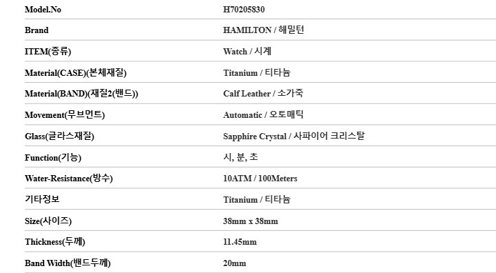 | 7. 주요 사양 | 티타늄 시계 오토매틱 |